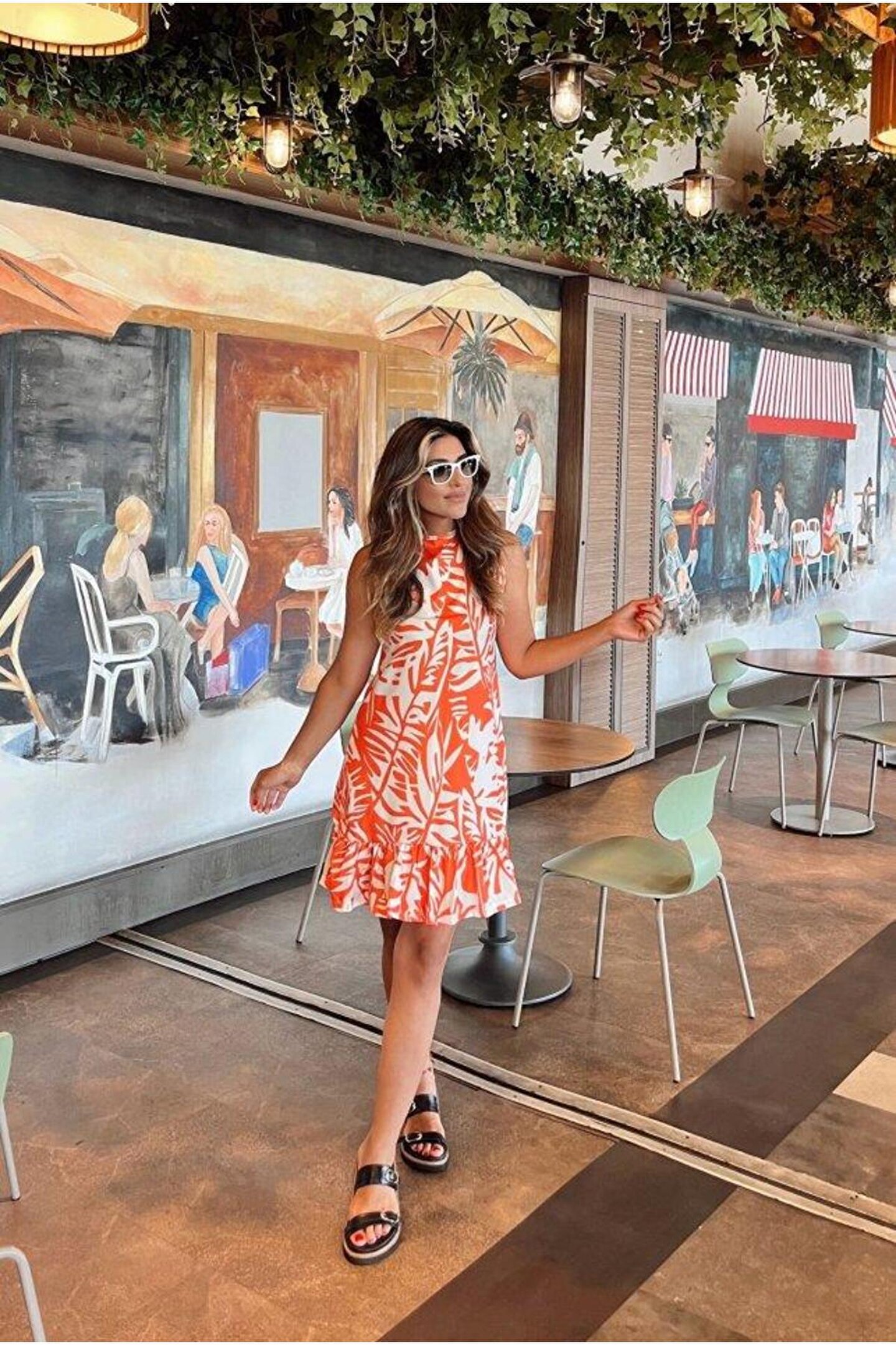 Kadın Sıfır Kollu Bisiklet Yakalı Fırfırlı Desenli Sofya Elbise
