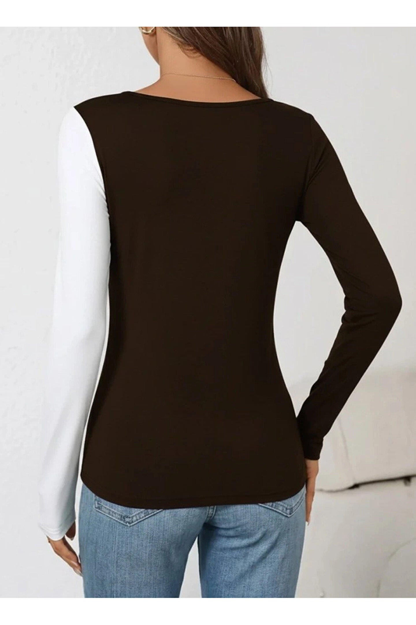Kadın Uzun Kollu Geometrik Yaka Detaylı çift Renkli Viskon Bluz