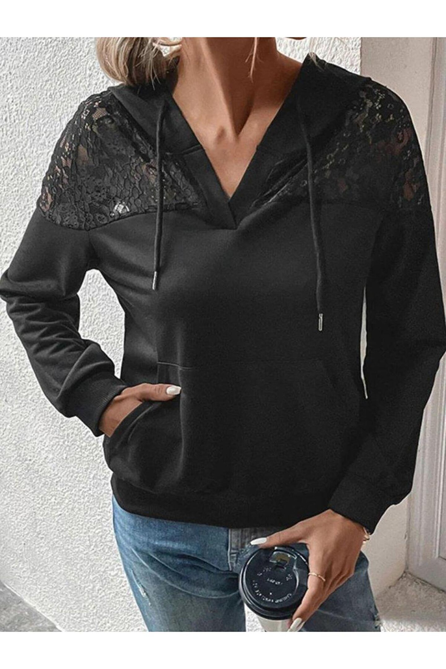 Kadın Uzun Kollu Kapşonlu Bağcıklı Dantelli Viskon Iki Iplik Bluz