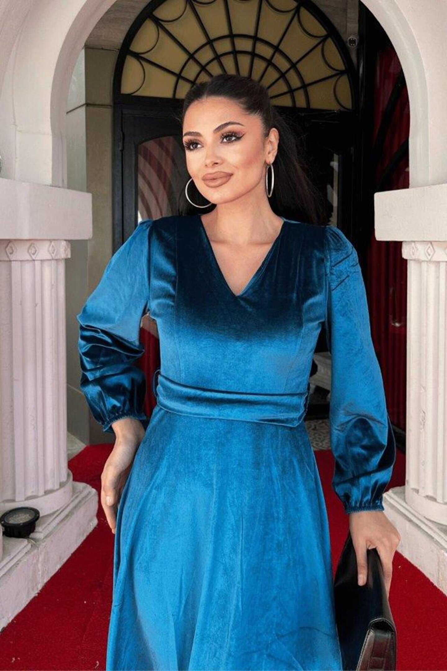 Kadın Uzun Kollu V Yaka Kuşak Dahil Kadife Kumaş Midi Boy Elbise