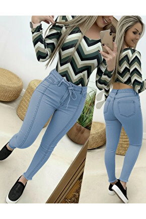 Kadın Yüksek Bel Belden Kuşaklı Yırtık Detaylı Kot Pantolon