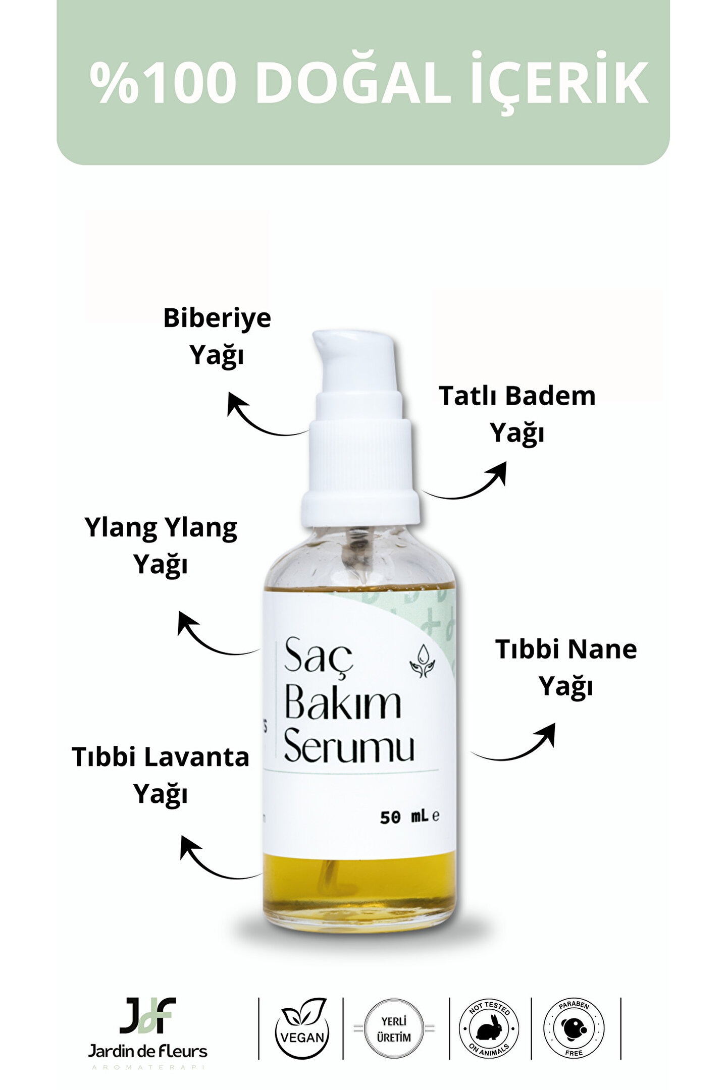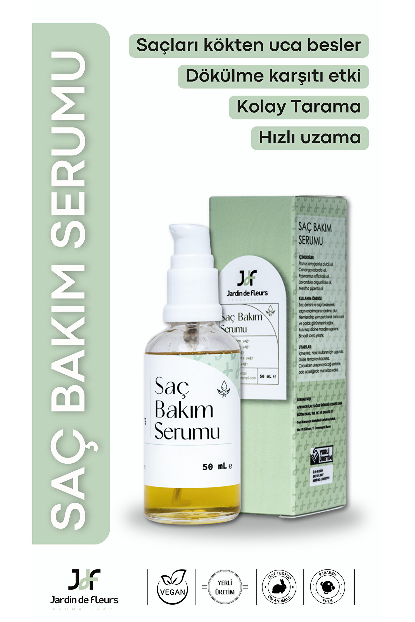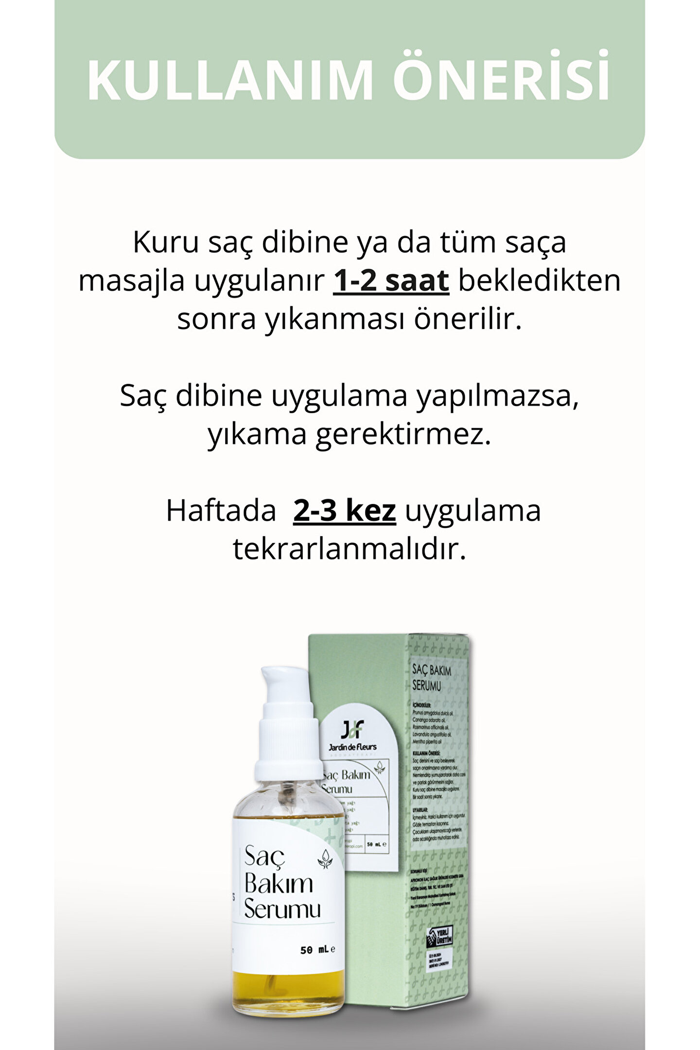 Unisex kullanım imkanıyla herkesin rahatlıkla tercih edebileceği JdF Aromaterapi Saç Bakım Serumu ile tanışın! Bu etkili serumun içeriğinde bulunan tatlı badem yağı, biberiye yağı, tıbbi nane yağı, tıbbi lavanta yağı ve ylang ylang yağları sayesinde saç dökülmesine karşı etkin koruma sağlar.; Tüm saç tiplerine hitap eden formülüyle JdF Aromaterapi Saç Bakım Serumu, kuru saçların bile bakımını yaparak daha canlı ve parlak görünmesini mümkün kılar.; Ayrıca suya dayanıklı özelliği sayesinde duş sırasında bile kullanabileceğiniz bu serumu haftada 2-3 kez uygulamanız önerilir.; Saç bakım rutininize ekleyeceğiniz JdF Aromaterapi Saç Bakım Serumu ile saçlarınızın ihtiyaç duyduğu bakımı sağlayın! Ürünü kuru saç dibine masaj yaparak uygulayabilirsiniz; etki etmesini bekledikten sonra (1-2 saat sonra) yıkama işlemine geçebilirsiniz.; Bu basit ama etkili yöntemle mükemmel sonuçları yakalayacağınızdan emin olabilirsiniz!
