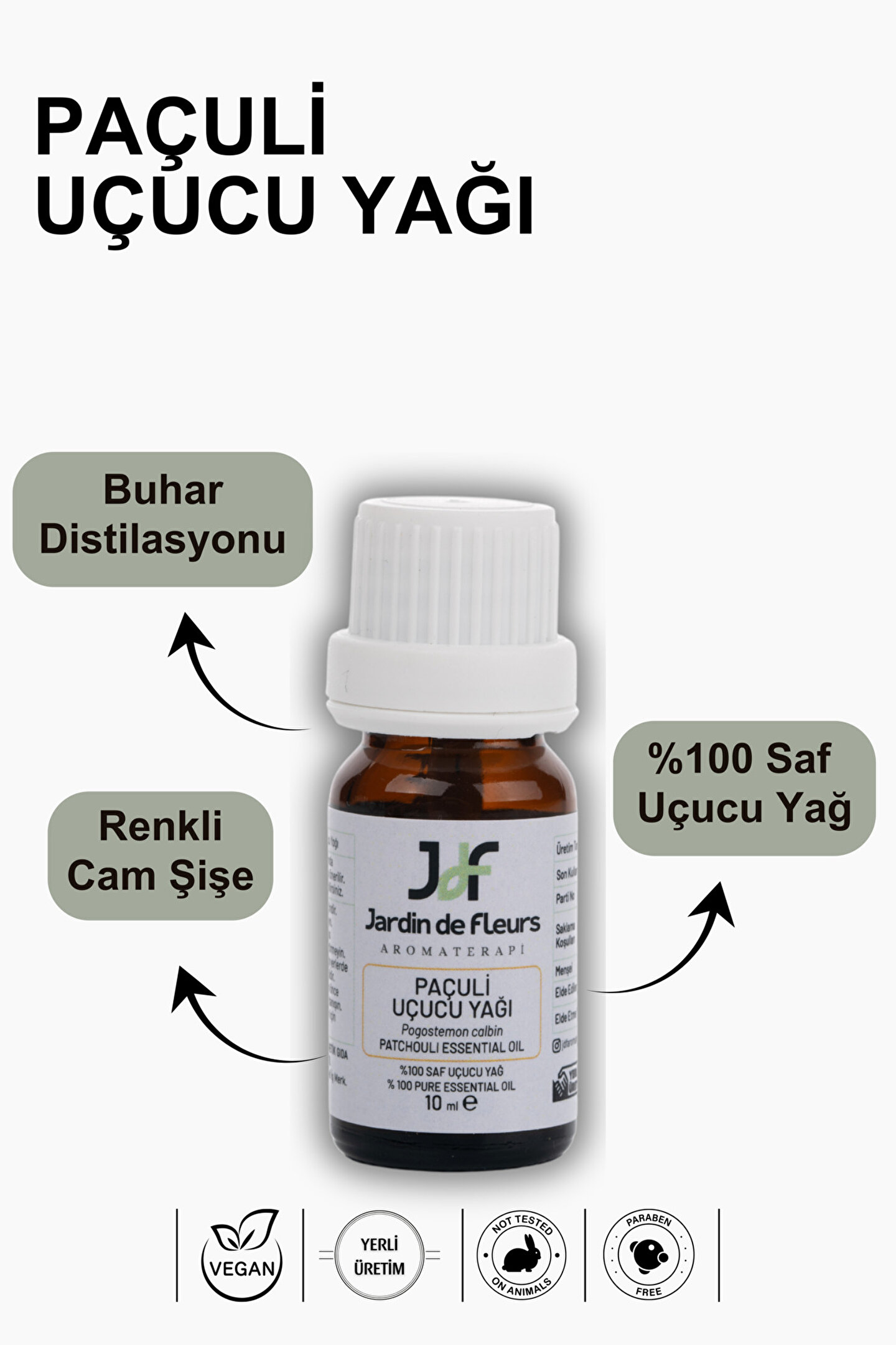 Paçuli uçucu yağı, yaprakların buharla damıtılmasıyla elde edilir. Paçulinin egzotik kokusu, herhangi bir aromaterapi harmanına büyük bir zenginlik katar. Paçuli yağının en etkili kullanım alanı koku sektörüdür. Paçuli yağı, birçok ünlü parfüm tasarımının bir bileşeni olarak tamamlayıcı bir nota ve sabitleyici olarak kullanılır.