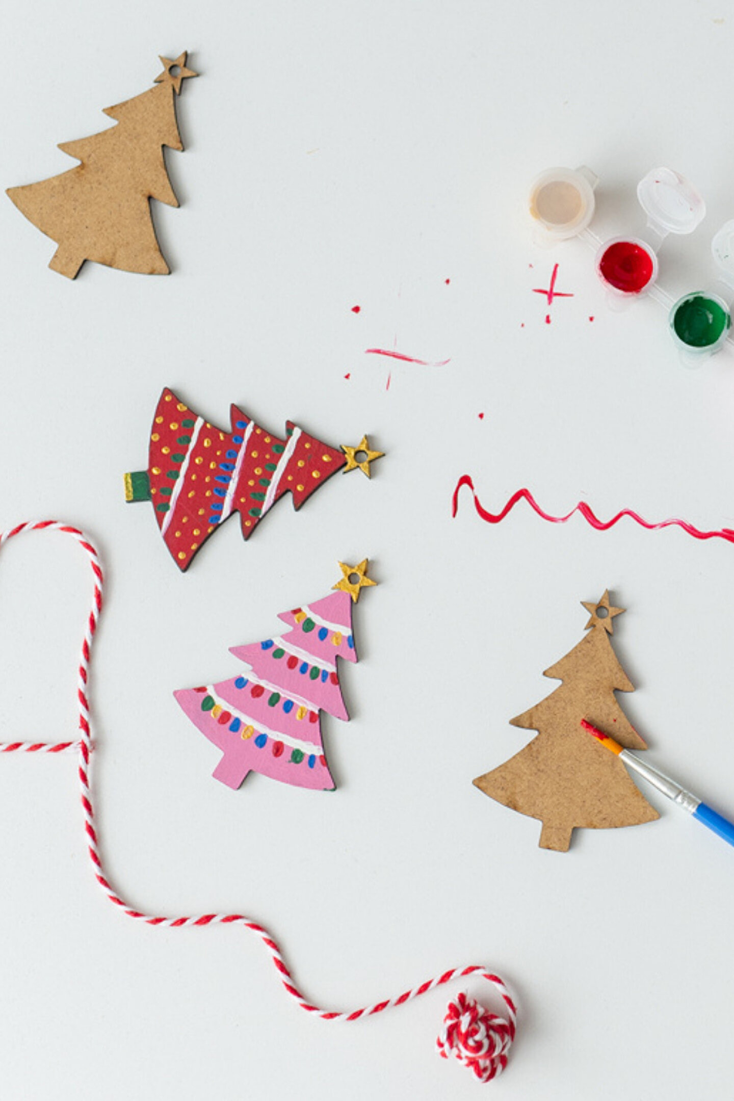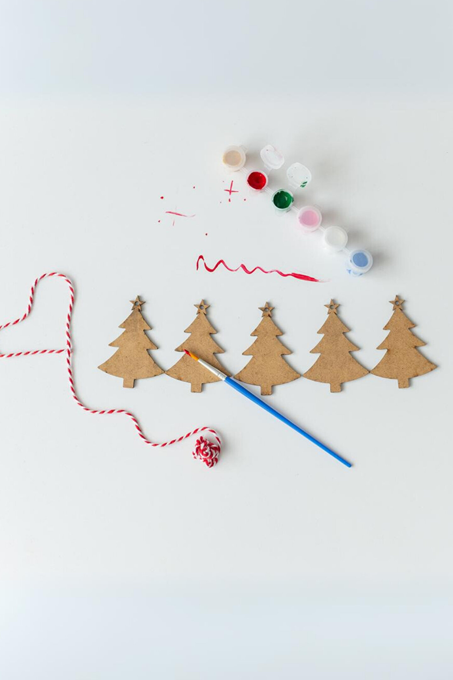 Set içeriği: 6 farklı renkte boya paleti, boya fırçası , 5 adet ahşap yılbaşı ağacı ,ip