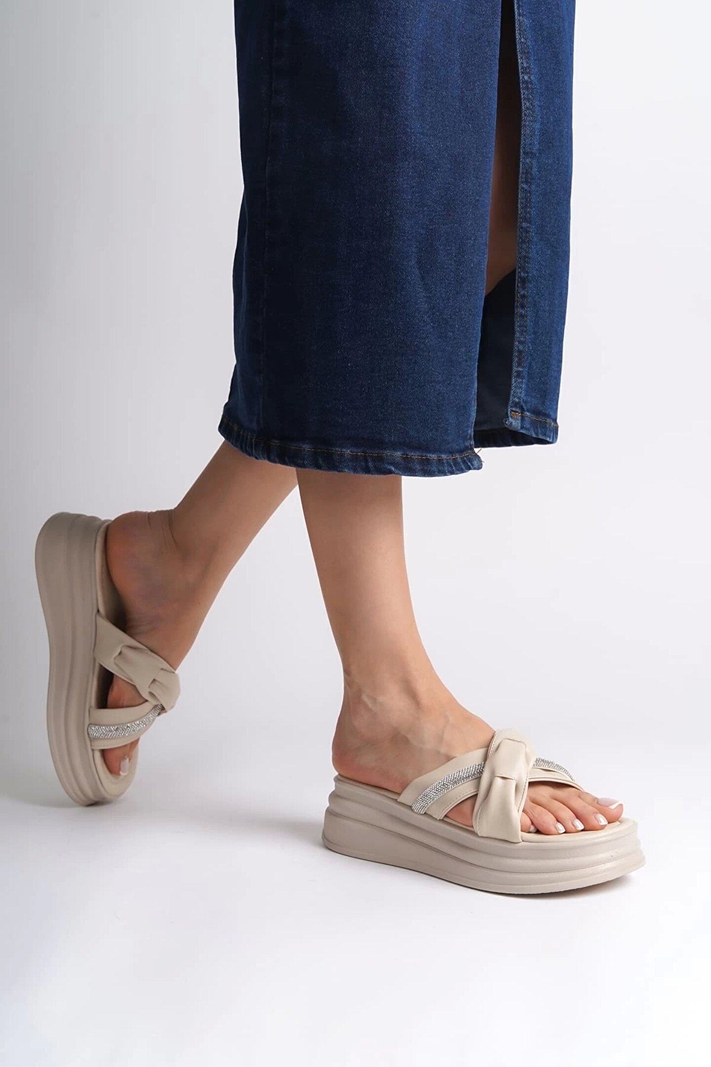 Joy Ayakkabı CLARA Düz Topuklu Kurdele Desenli Taşlı Kalın ve Ortopedik Taban Kadın Terlik CKT - Krem