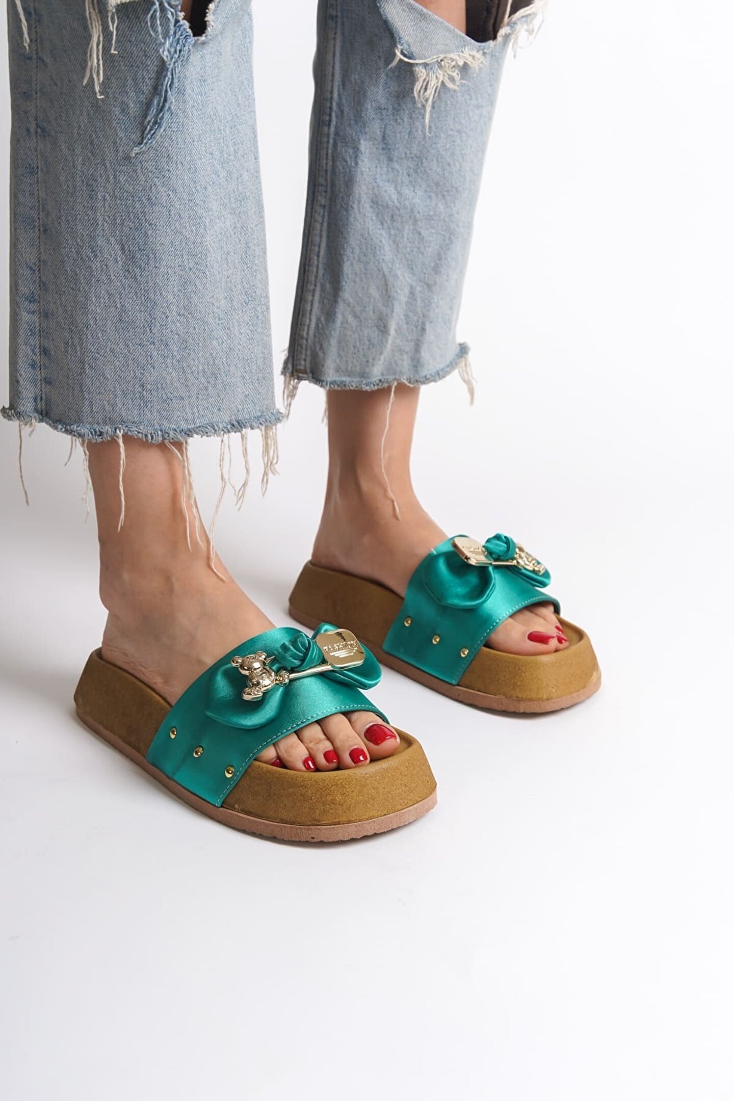 DILA Kalın ve Ortopedik Taban Ayıcıklı Saten Kadın Terlik SKT - Yeşil