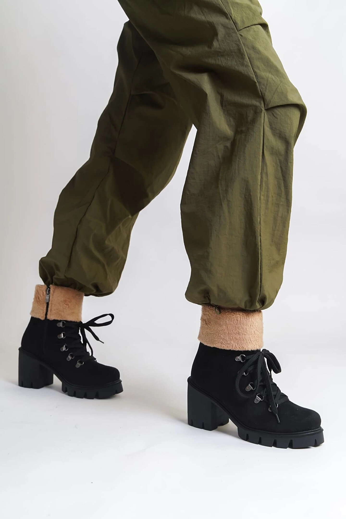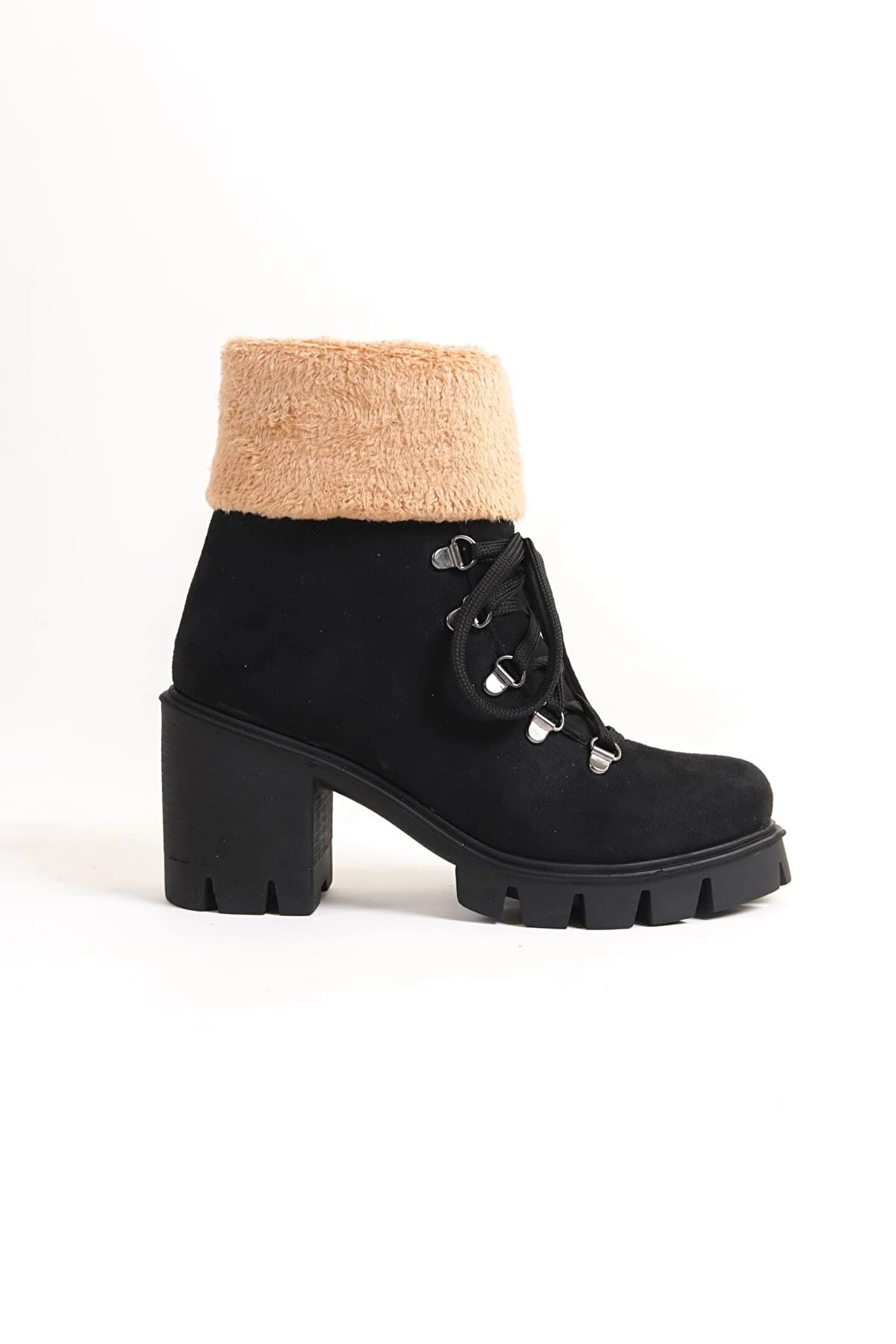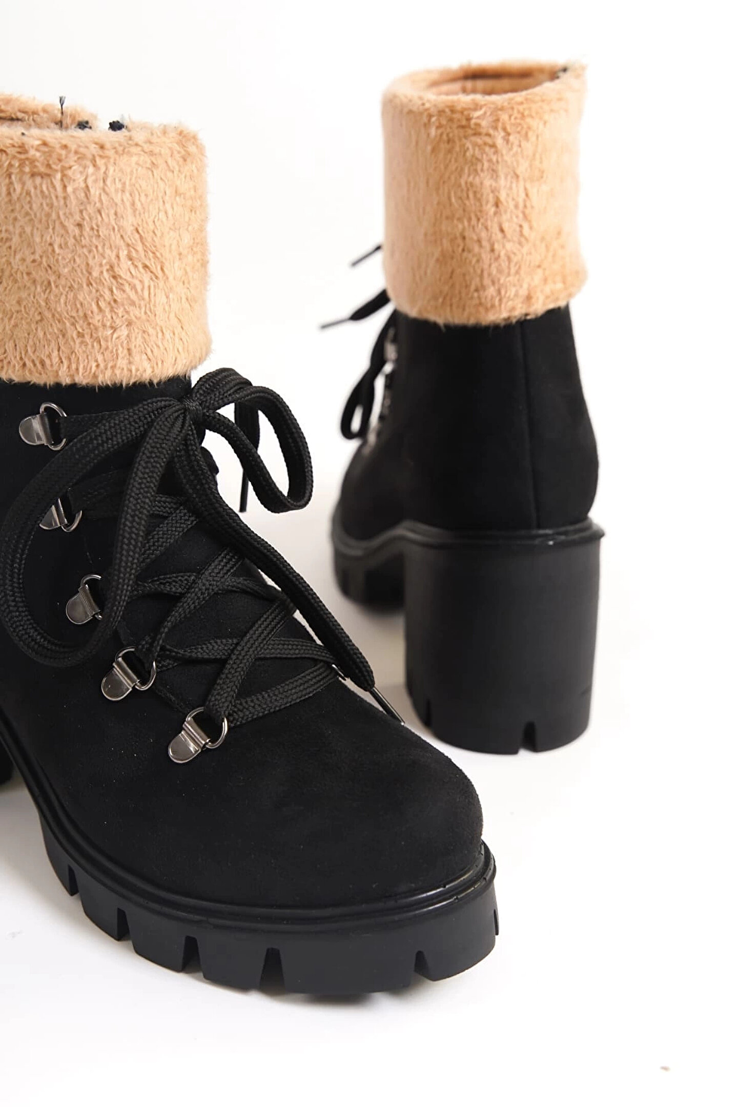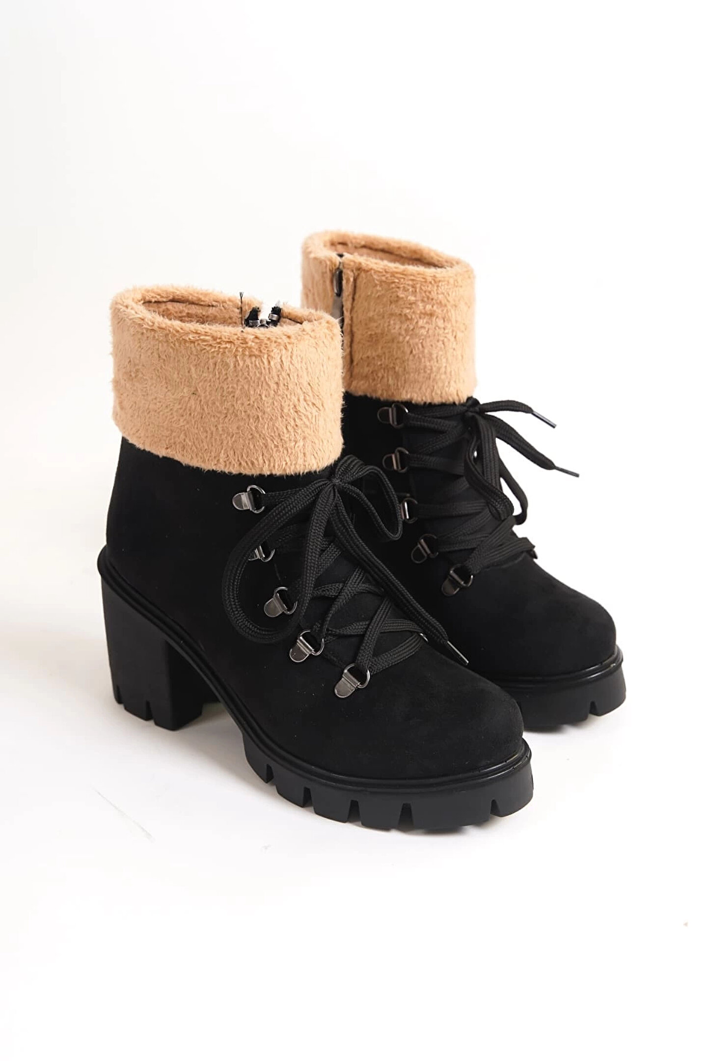 Joy Ayakkabı EMMA Bağcıklı Fermuarlı Ortopedik Taban Topuklu Kürk Detaylı Süet Kadın Bot SST - Siyah