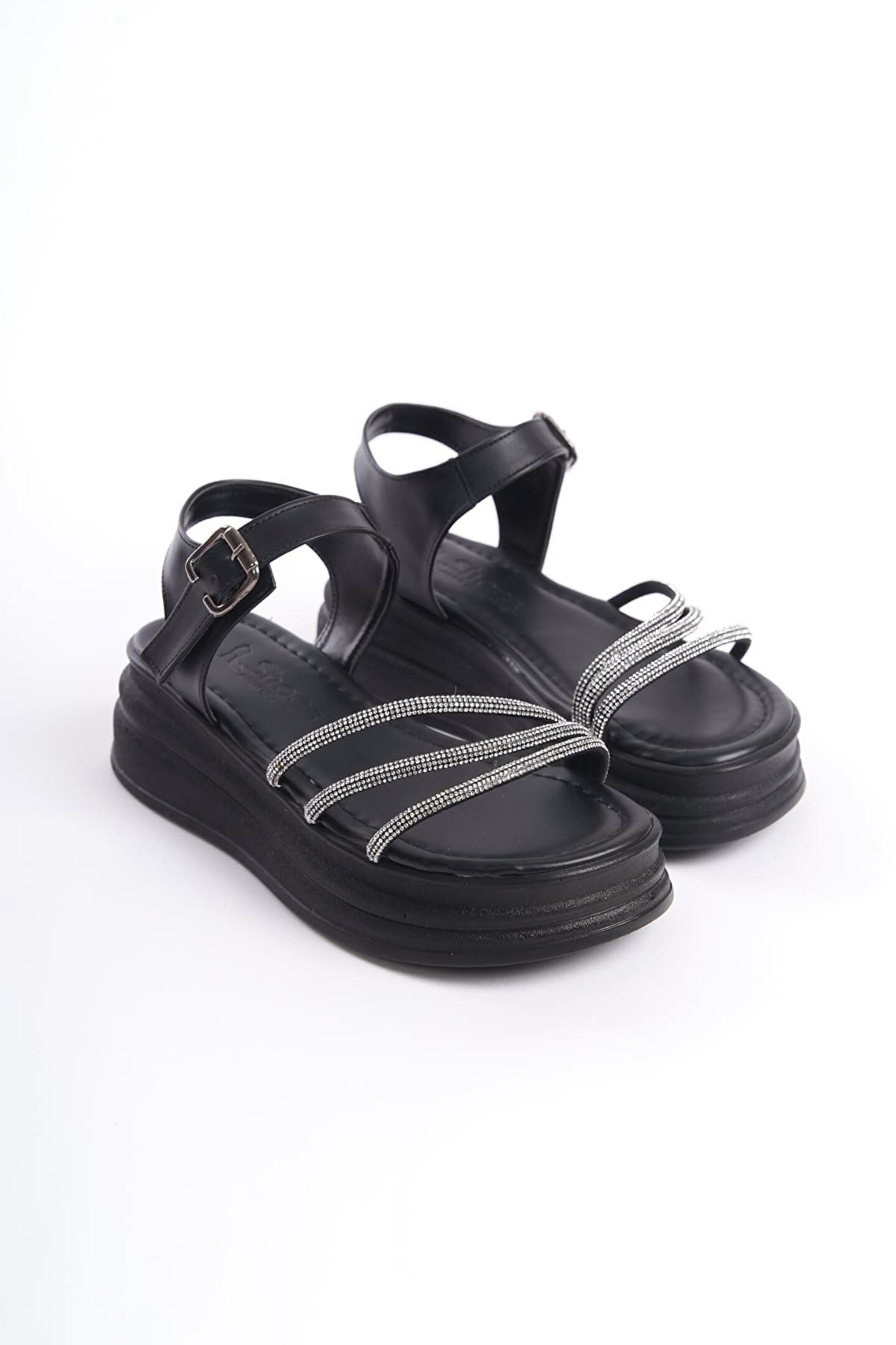 Joy Ayakkabı EVA Kalın Tokalı Taşlı Şeritli Ortopedik Taban Kadın Sandalet CST - Siyah