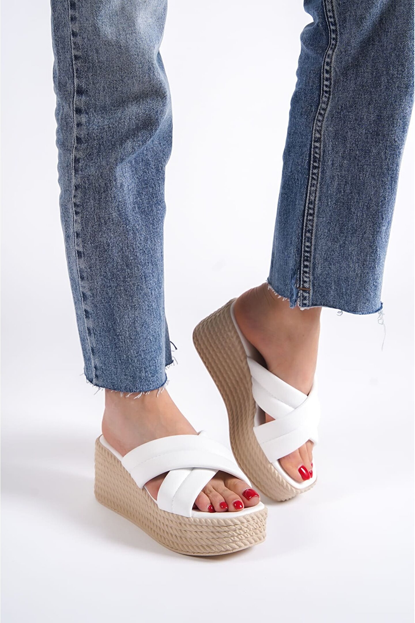 JOYMIX Dolgu Topuklu Ortopedik Taban Hasır Görünümlü Kadın Terlik CKT - Beyaz