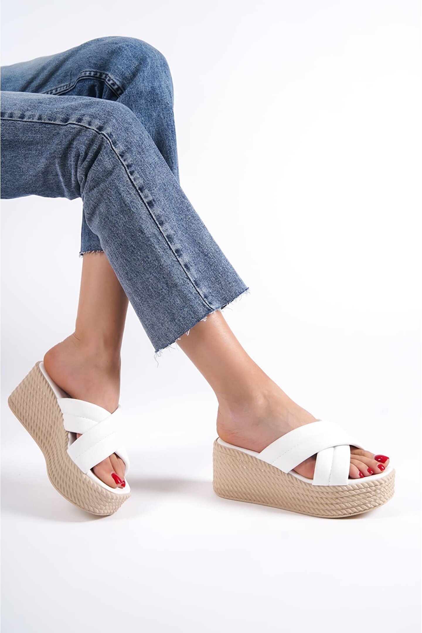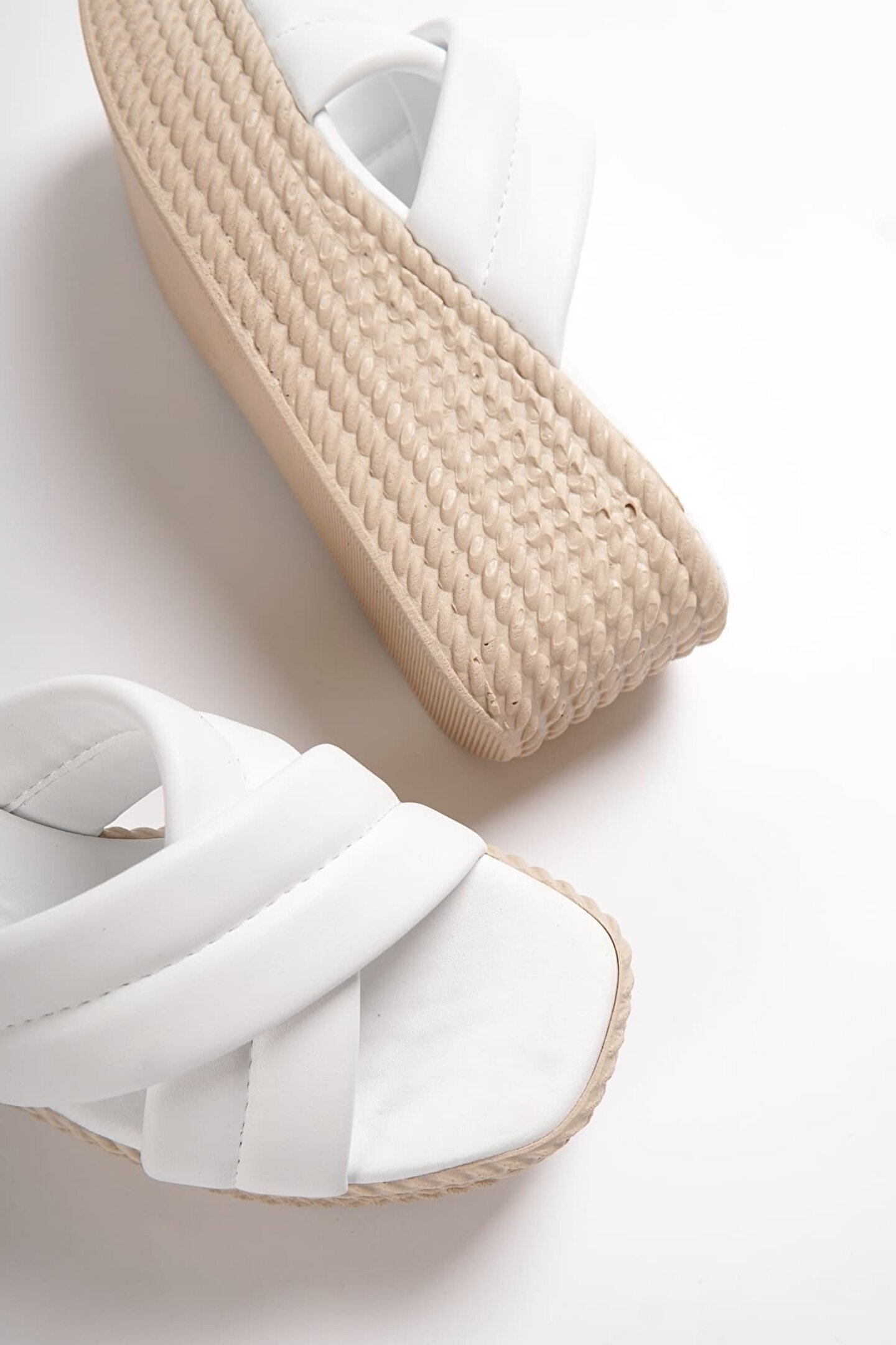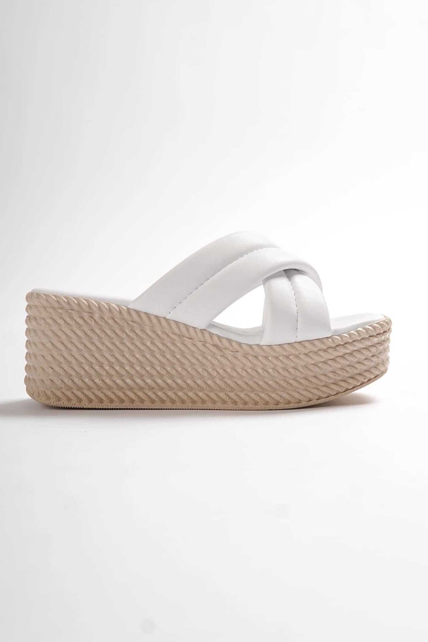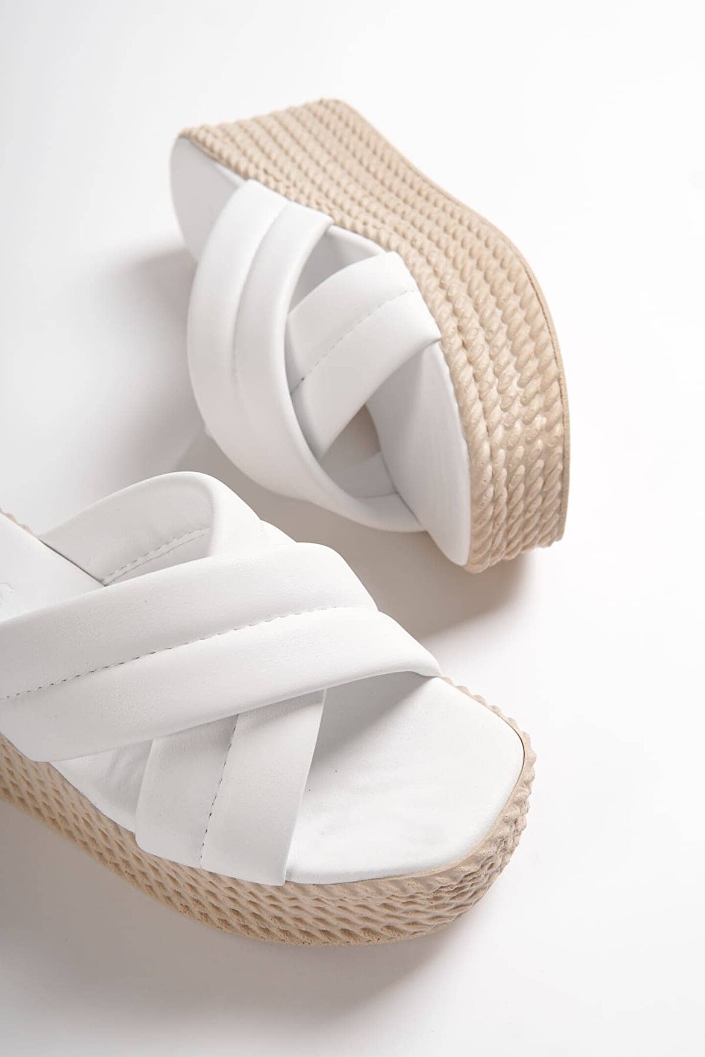 Joy Ayakkabı JOYMIX Dolgu Topuklu Ortopedik Taban Hasır Görünümlü Kadın Terlik CKT - Beyaz