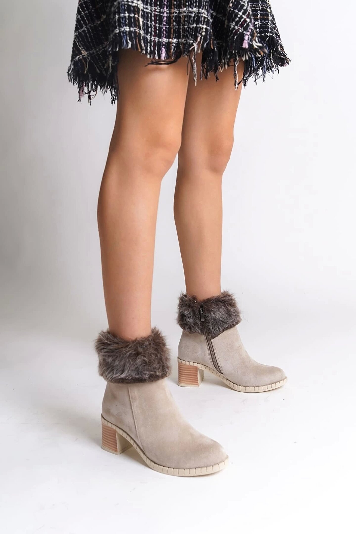 JULIA Fermuarlı Ortopedik Taban Tüylü Topuklu Süet Kadın Bot SKT - Krem