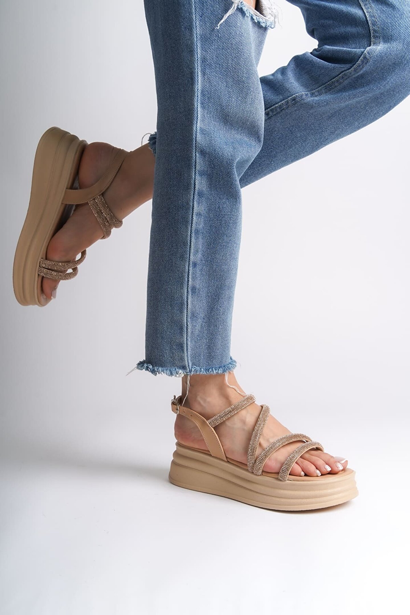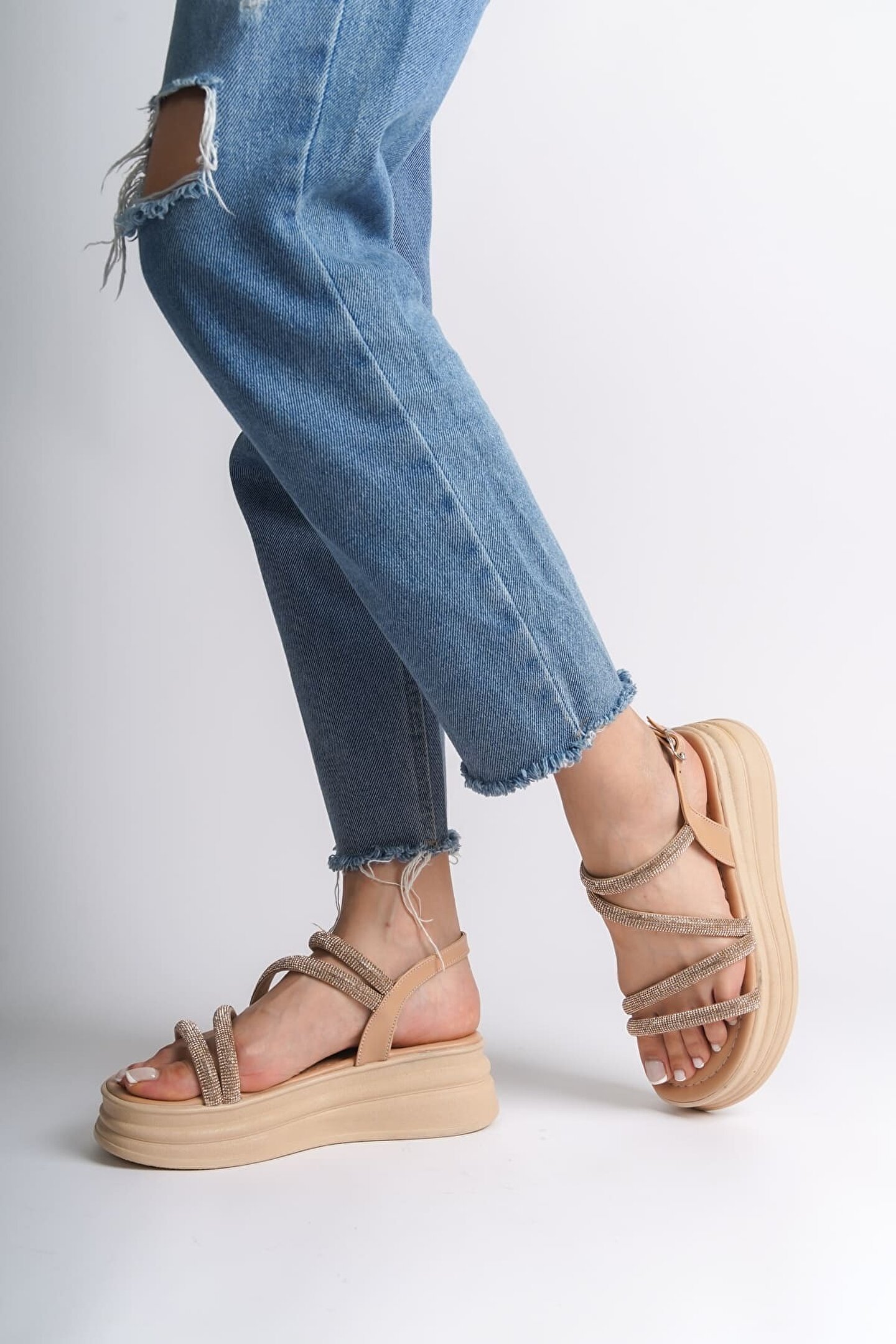 Joy Ayakkabı RILEY İnce Tokalı Taşlı Şeritli Ortopedik Taban Kadın Sandalet CTT - Ten
