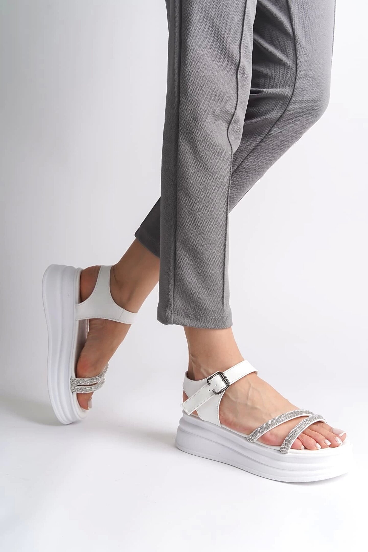 Joy Ayakkabı ZLOHE Kalın Tokalı Taşlı Şeritli Ortopedik Taban Kadın Sandalet CBT - Beyaz
