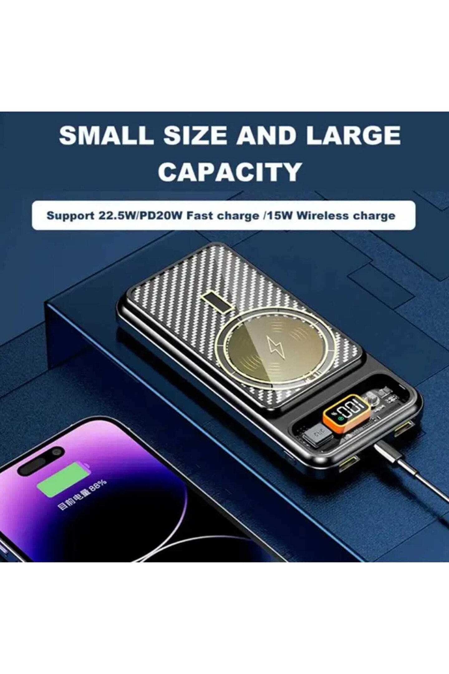 Hızlı Şarj Desteği, LED Ekran, Kablosuz Şarj, Manyetik, 15WMagneticKablosuz Şarj Cihazı PowerBank Tip Ultra İnce, Hızlı Şarj, Fişli, Yüksek Kapasite, Kablolu, Kablosuz Şarj Cihazı, LED Ekran, 2'si 1 arada hızlı şarj cihazı güç bankası Çıkış gücü 15W Pil Kapasitesi 10000mAh Giriş Tip C/Mirco 15W, USB-A 5V/2A Çıktı USB 15W(maks), Tip C 15W,Usb-A 5V/2A Manyetik kablosuz çıkış 15W(maks.) Özellikler Dahili Şarj kablosu ve hızlı şarj Destek cihazları Akıllı Telefonlar/mp3/mp4 Renk Siyah, Boyut 148*68,8*17,8 mm Detayları 1*PD 22.5W Hızlı Şarj Tek öğe Tek paket boyutu: 12X11,5X3,2 cm Tek brüt ağırlık: 0,350 kilo