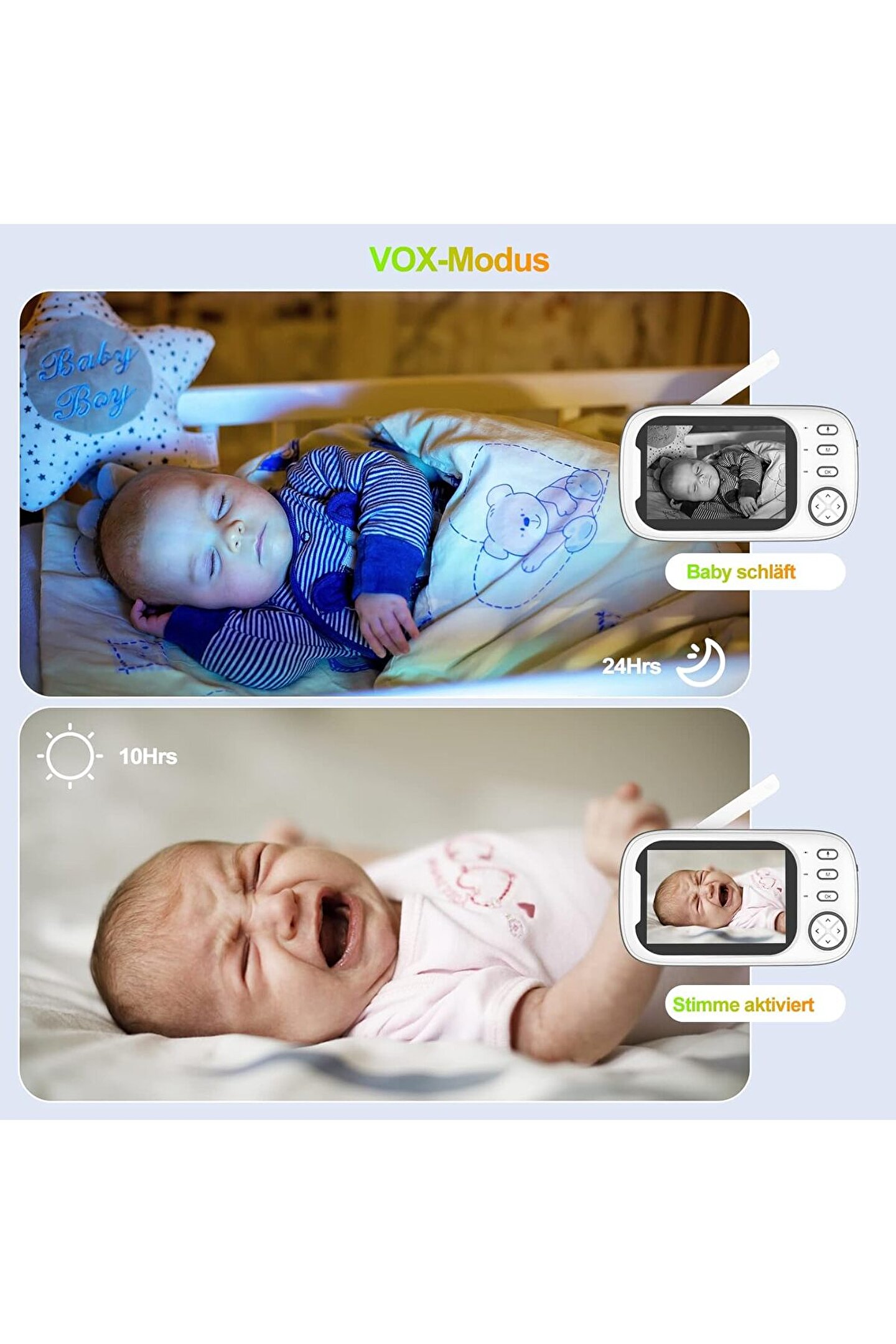 Açıklama Ürün listesi Ürün listesi1 * Kamera1 * Oyuncu1 * Kullanım Kılavuzu2 * Güç Adaptörü + güç şarj kablosu * 2; 4G kablosuz iletim, daha kararlı ve pürüzsüz ses ve video sinyalleri, taşınabilir tasarım; * 3; 5 inç yüksek çözünürlüklü LCD renkli ekran, artık bebeğinizi uyumak için gönül rahatlığıyla net bir şekilde izleyebilirsiniz; * Doğru sıcaklık izleme, iç mekan sıcaklığının gerçek zamanlı izlenmesi, bebeğinizin sağlığının yakından bakımı; * İki yönlü gerçek zamanlı sesli interkom, artık bebeğin sesini uzaktan duyabilir ve ayrıca monitörün diğer tarafında bebeğinizle konuşabilirsiniz; * Dahili 8 bebek ninnisi, bebeğinizin tatlı rüyalara hızlı bir şekilde girmesine yardımcı olmak için; * Dahili gelişmiş profesyonel düzeyde VOX fonksiyonu, çevredeki ses ortamının akıllı tespiti, herhangi bir anormal sesin etrafındaki bebek, monitör hızlı bir şekilde tanımlayabilir ve iki yönlü interkom moduna girebilir; Şartname: 1; İletim Frekansı: ISM 2400 ~2483,5 MHz2; İletim Gücü: 17dBm3; Engelsiz Etkili Aralık: 160ft/50m iç mekan, 850ft/260m dış görüş hattı4; Spektrumu Yay: AFH VE TDMA5; Modülasyon Modu: GFSK6; çalışma sıcaklığı: 14 ~ 122° Fahrenheit /; 10 ~ +45° Santigrat7; Çalışma Nemi: <85%;