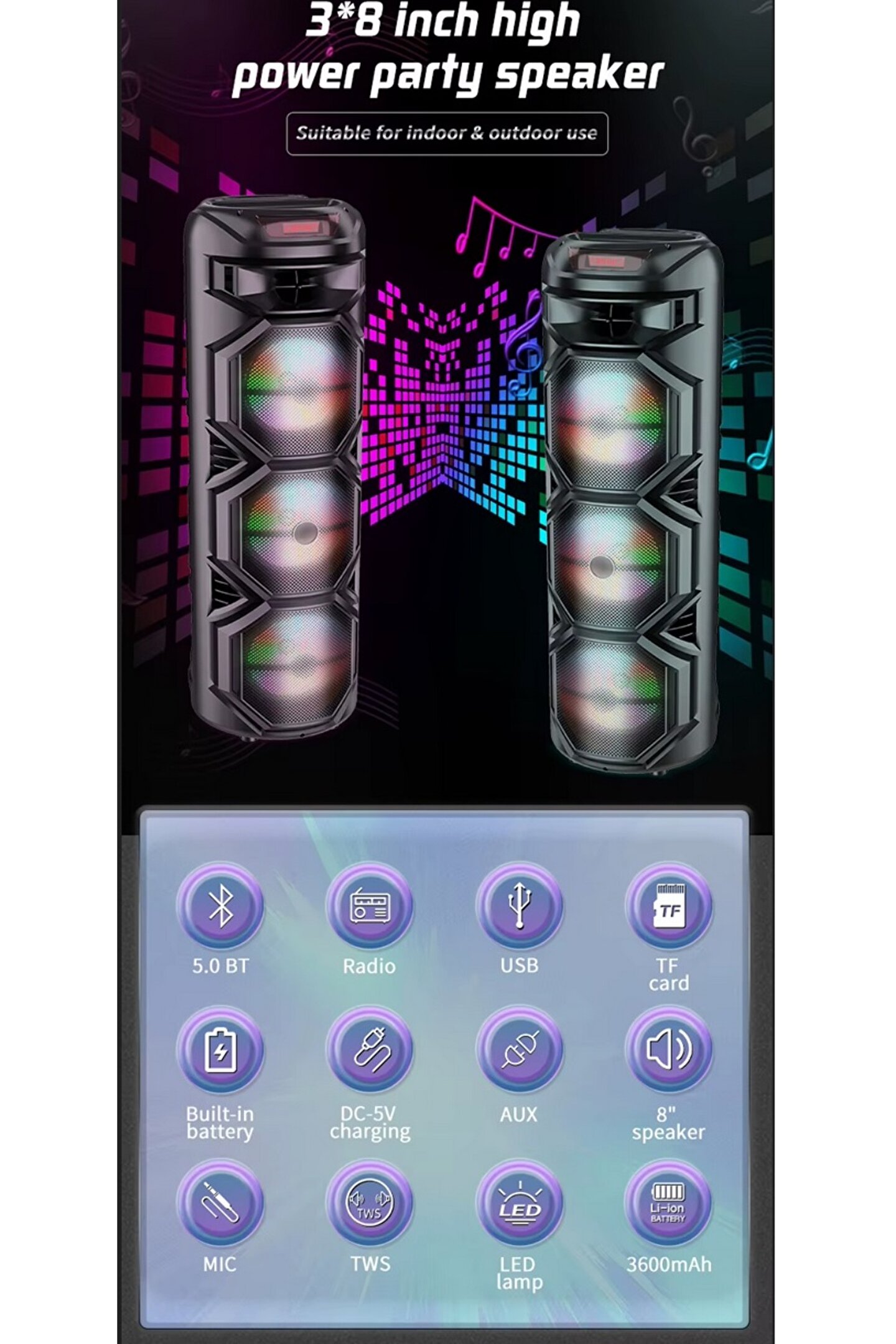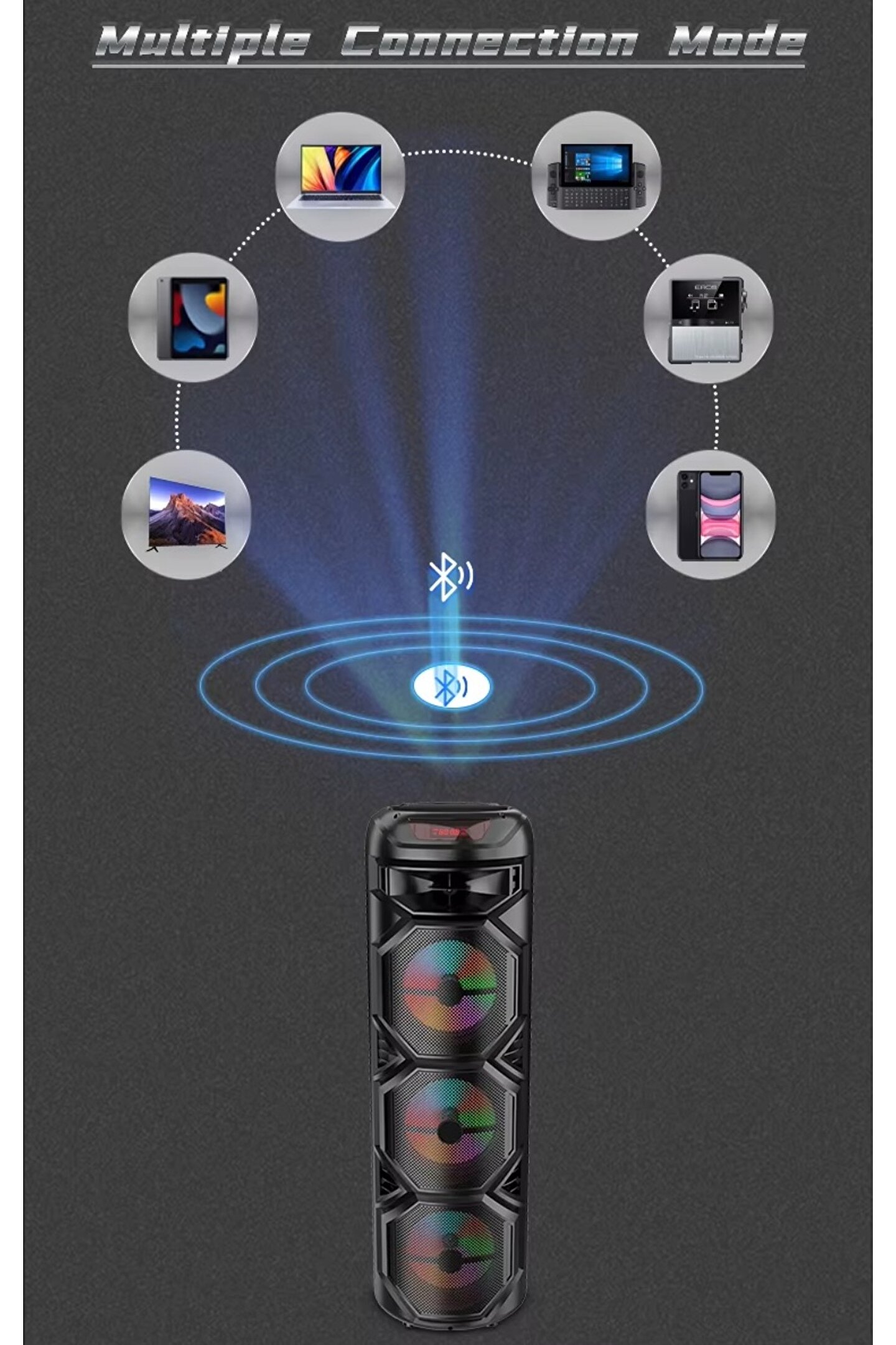 3X8 İNÇ BÜYÜK BOY TEKERLEKLİ BLUETOOTH SPEAKER ŞARJLI KABLOSUZ MİKROFONLU HOPARLÖR ; 3X20W HOPARLÖR ; 3600MAH BATARYA ; 29X29X90CM ; USB/TF/FM/BT/MİC/TWS ; LED IŞIKLI ;