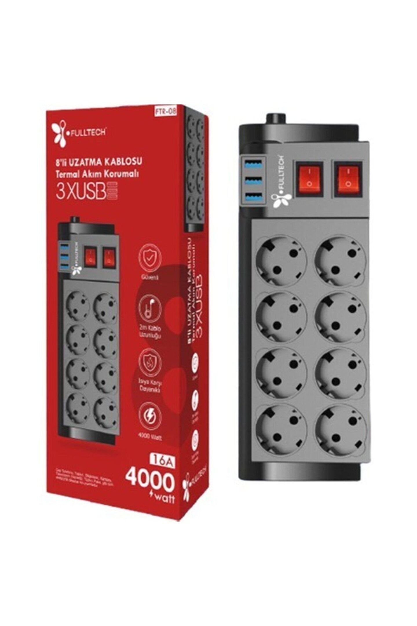 Akım Korumalı 8 Li Priz Açma Kapama Anahtarlı 3 Usb Çıkışlı 2 Metre Kablo Uzunluğu