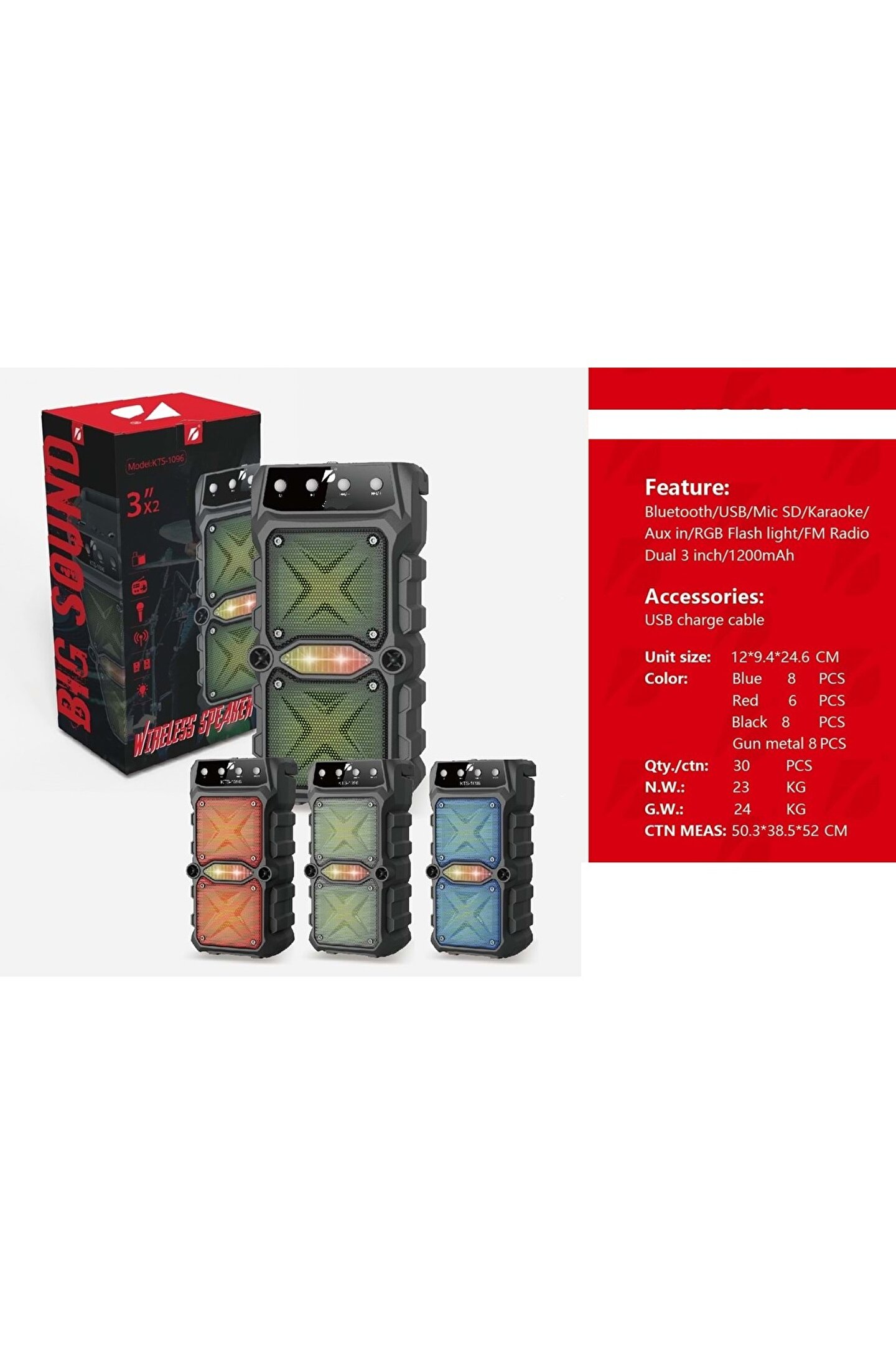 <div id="rich-content-wrapper"> <div> <table> <tbody> <tr> <td colspan="1" rowspan="1"> <div> Model: KTS1096 <br> </div> </td> </tr> </tbody> </table> <div> Girişler: mikro SD, USB, radyo, mikrofon. <br> </div> <div> Aksesuar: V8, şarj kablosu <br> </div> <div> Mod: Bluetooth 5.0/FM radyo <br> </div> <div> Pil süresi: 3-4 saat <br> </div> <div> Pil şarj süresi: 2-3 saat <br> </div> <div> Pil kapasitesi: 1200mAh <br> </div> <div> Güç çıkışı: 5W * 2 <br> </div> <div> Voltaj: DC 5V <br> </div> <div> Frekans: 100Hz-120KHz <br> </div> <div> <br> </div> <div> Özellikleri <br> </div> <div> -Cep telefonu desteği <br> </div> <div> -Taşınabilir <br> </div> <div> -USB girişi (kalem sürücü) <br> </div> <div> -TF kart girişi <br> </div> <div> FM radyo <br> </div> <div> -Bluetooth <br> </div> <div> -Mikrofon girişi <br> </div> <div> * İyi performans ve sürenin pili. * <br> </div> <div> Yükseklik: 25cm genişlik: 12cm. <br> </div> <div> <br> </div> <div> <br> </div> </div> </div>