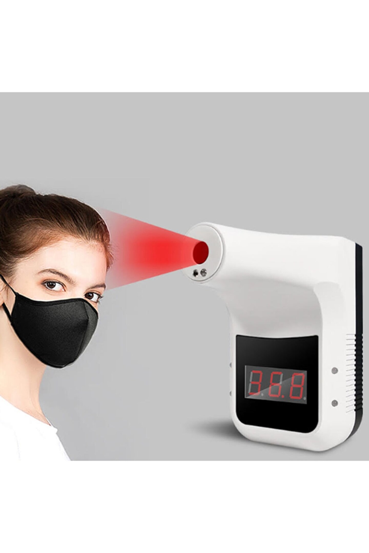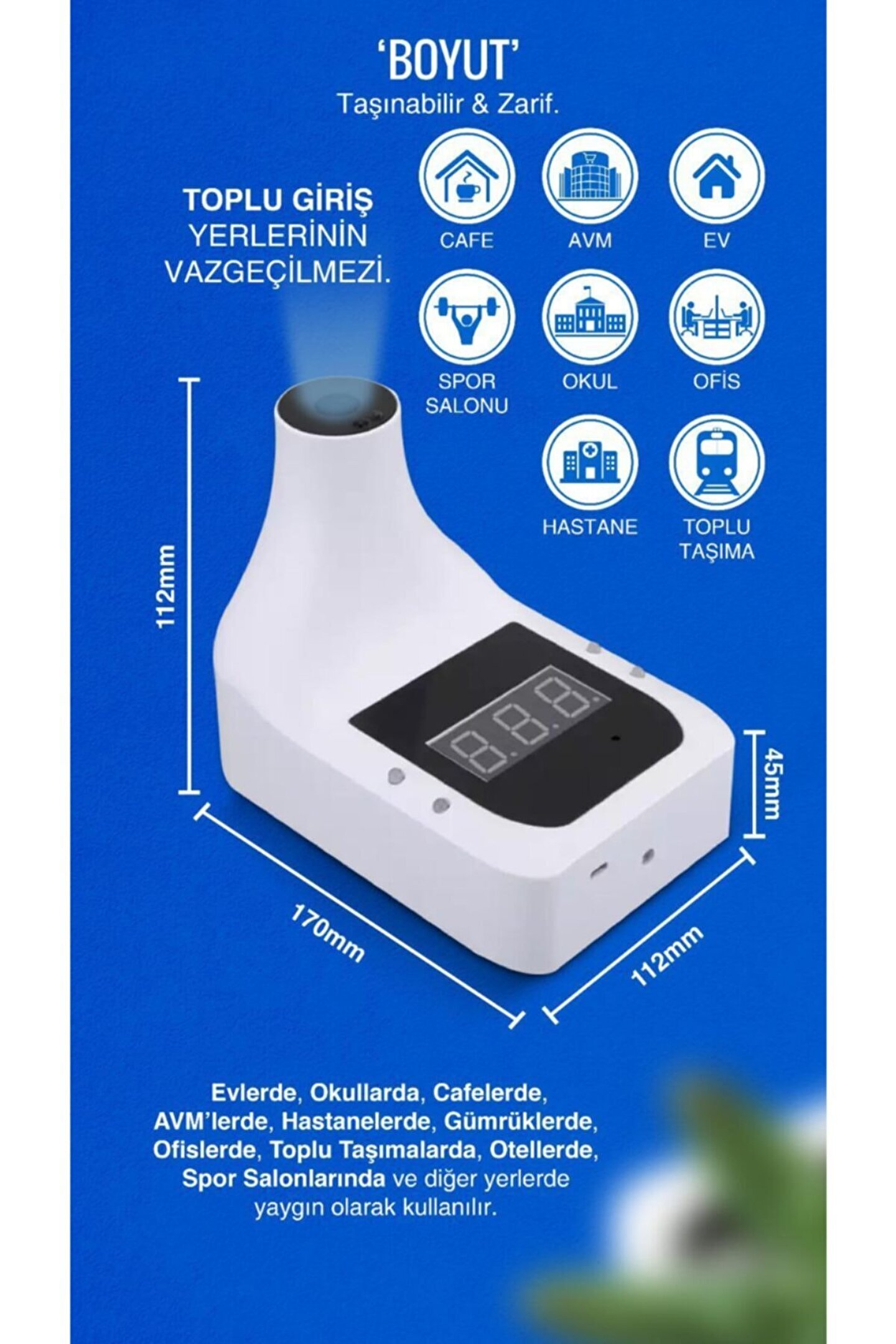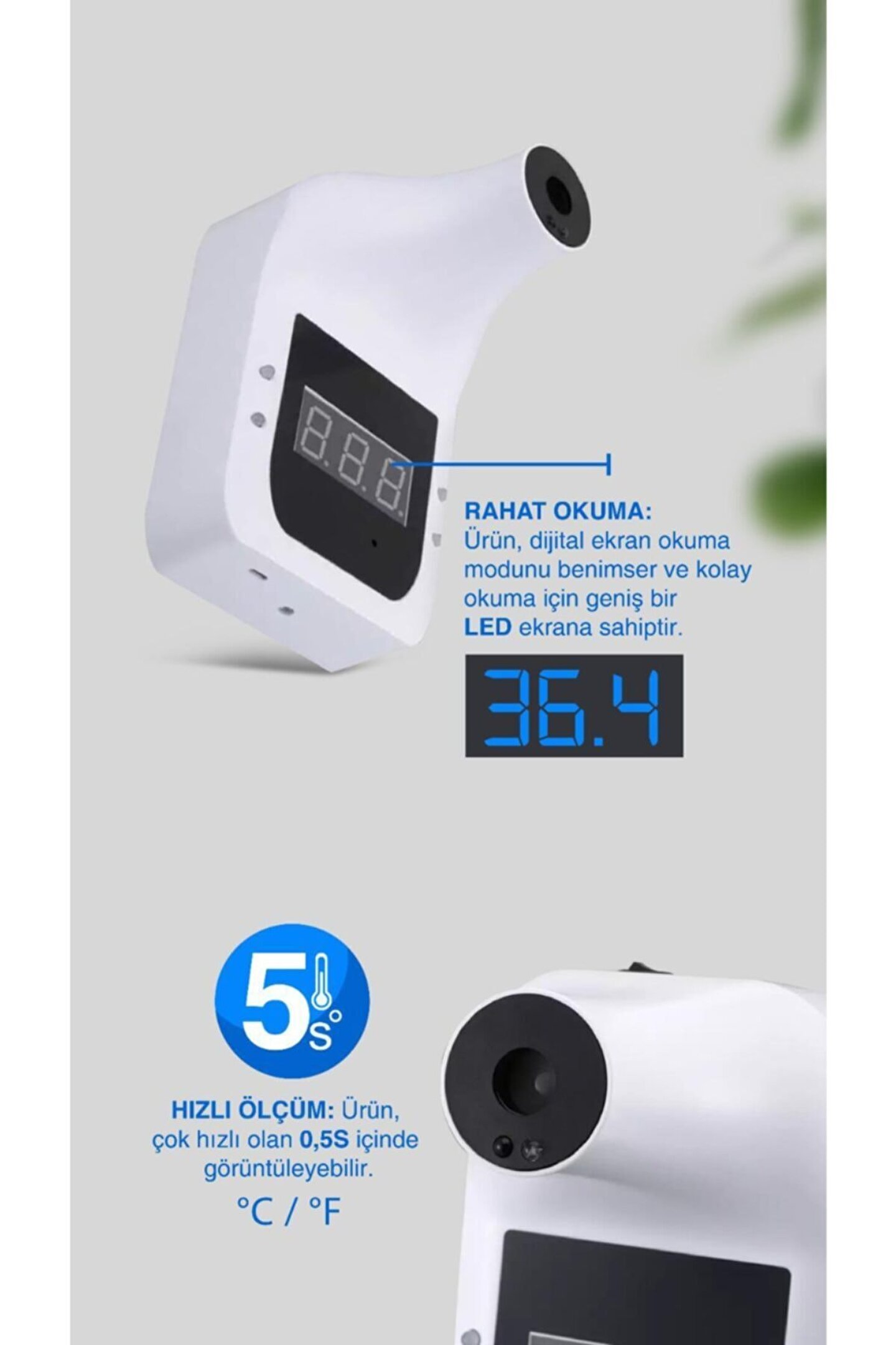 TEMASSIZ ATEŞÖLÇER Restoran, Kafe, Okul, Hastane, AVM, Fabrika ve İşletmenizin Sağlık ve güvenliği için Otomatik Temassız Ateş Ölçer cihazı Alından ve bilekten ve avuç içinden ateş ölçer, 0,5 saniyede ateş ölçme ve hızlı geçiş özelliği sayesinde kalabalık ve yoğun iş yerlerinde beklemeden geçiş yapma özelliğine sahiptir; 5 volt input giriş özelliği ile cep telefonu adaptörü; Normal ateş ölçümlerinde Yeşil led ışıklı ve sesli uyarı özelliği; Yüksek Ateş ölçümünde Kırmızı led ışıklı ve sesli alarm özelliği; TEMASSIZ ATEŞ ÖLÇER; U?ru?n elektrik bag?lantısı olmadan c?alıs?abilir; Li; Ion şarj edilebilir pil sayesinde mobil c?alıs?ma o?zellig?ine sahiptir; Cihaz yu?ksek ates? algıladıg?ında riskli kis?iyi alarm uyarısı vererek uyarır; Cihaz duvara vida ile sabitlenebilir ya da c?ift taraflı bantla yapıs?tırılabilir; Cihaz tripod ayak bag?lantı c?ıkıs?ı o?zellig?i sayesinde tripod stand ile kullanılabilir; Restoran, Kafe, Alışveriş merkezleri, İbadethaneler, Okullar, Fabrikalar ve tüm iş yerlerinde kullanılmak üzere tasarlanmış olup, sosyal mesafenin önemli olduğu bu süreçte elle ölçüm yapan cihazların bulaş riski taşıma olasılığını ortadan kaldırmak üzere üretilmiştir; Ateş ölçüm cihazına pil dahil olup, TRİPOD AYAK DAHİL DEĞİLDİR; Not; Piyasada kullanılan tüm İNCE KALEM PİLLER ve Tripod ayaklar cihaza uyumludur; TEKNİK DATA Doğruluk: ± 0; 2 Derece Tepki süresi : 0; 5 saniye Anormal sıcaklık alarmı : Sesli ve ışıklı uyarı Enerji beslemesi : USB şarj veya 4 ADET İNCE Pil Otomatik ölçüm mesafesi : 5; 10 cm Giriş volt : USB DC 5V Bekleme süresi : 1 Haftaya kadar (kullanılan pil kapasitesine göre değişir) Ağırlık : 350 gr Kurulum yöntemleri : Tripod ayak, Çift taraflı bant, Duvar askısı Ölçü : 170; 115; 140 mm Sıcaklık ölçüm aralığı : 0; 50 Derece Çalışma sıcaklığı : 15; 35 Derece Uyarı süresi : 5 saniye ses ve kırmızı led ışık Ekran : Dijital gösterge;