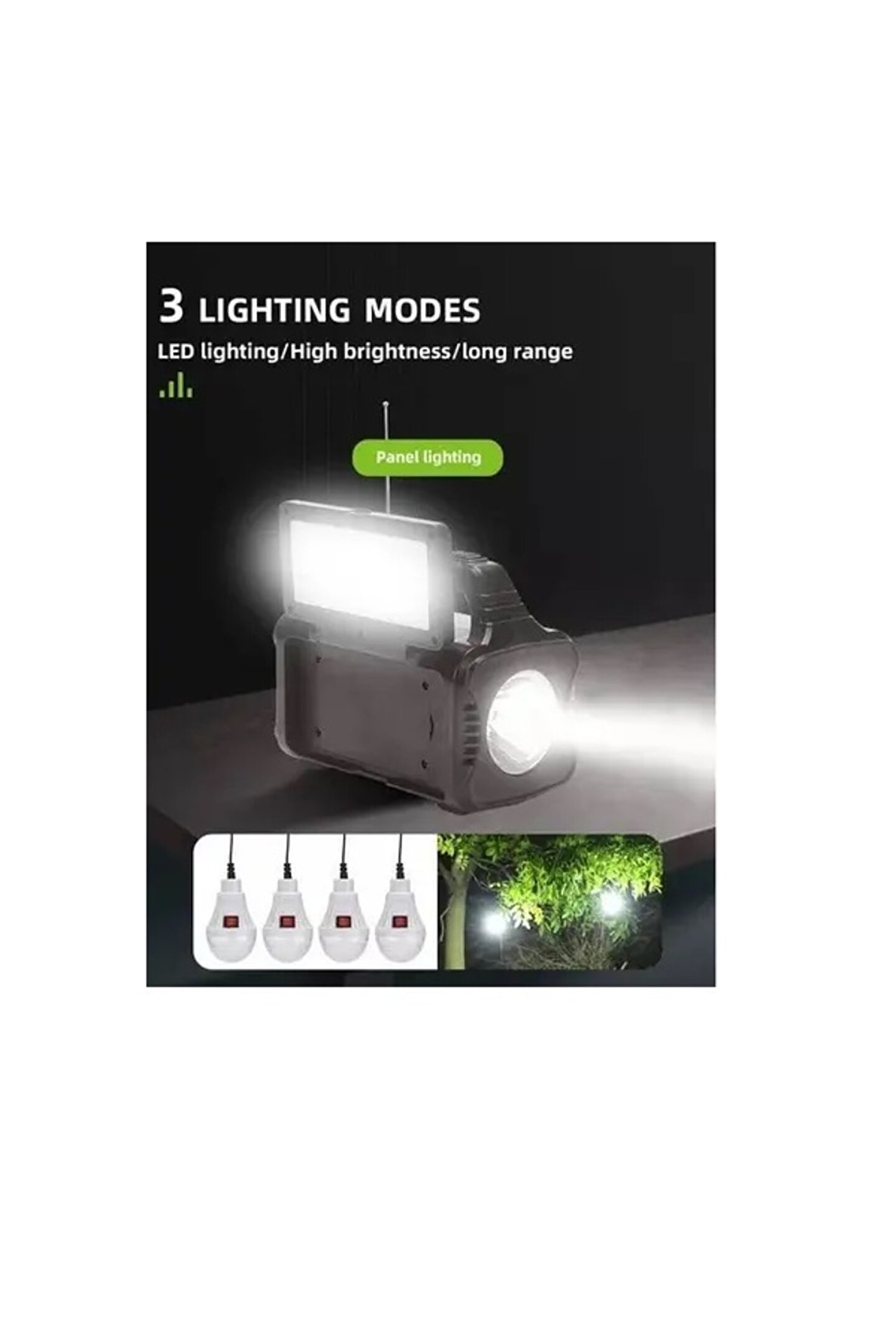 Taşınabilir istasyon.3 m kablolu güneş enerjisi paneli.Telefonları şarj etmek için kablolar.220 V ağdan şarj etmek için kablo.AÇMA/KAPAMA düğmeli 5 metrelik bir kablo üzerinde ampuller - 4 adet.Güç ve aydınlatma için solar şarj sistemi elektriğinizin olmadığı durumlar için ideal çözümdür.İster izole bir alanda, kampta veya elektrik kesintisinde olun, güneş kiti size ihtiyacınız olan tüm olanakları sunar: 4 SMD LED ampul aracılığıyla taşınabilir aydınlatma, LED lambanın yardımıyla ve cep telefonlarını ve diğer cihazları şarj etme 6V pil sisteme dahildir.Ampuller doğrudan sistem pilinden güç alır ve gece lambası olarak kullanılabilir. ; Özel asma sistemi (kordon) sayesinde kamp yaparken çadır önüne kolayca monte edilebilirler. ; Ampullerin tel üzerinde bir AÇMA/KAPAMA düğmesi vardır.Özellikler:Uygulama: Ev, Doğa, Yürüyüş, GezilerGüneş paneli tipi: Monokristal silikonPil tipi: kurşun asitDenetleyici türü: PWMÇıkış gerilimi (USB): 5 volt 1AÇıkış frekansı: 50 HzŞarj süresi (sa): 12-15 saatTelefonunuzdan müzik dinlemek için yerleşik Bluetooth.FM radyoMp3 oynatıcıFenerRenk siyah/yeşilPil: 6V 10000 mAh kurşun-asitMalzeme: ABSYükler: 4,6 W set, LED lambalarŞarj yöntemi: güneş paneli 9V (3,5 watt)/DC9V/AC110V-220Vİşlev: MP3 Çalar/FM Radyo/Spot Işığı/;