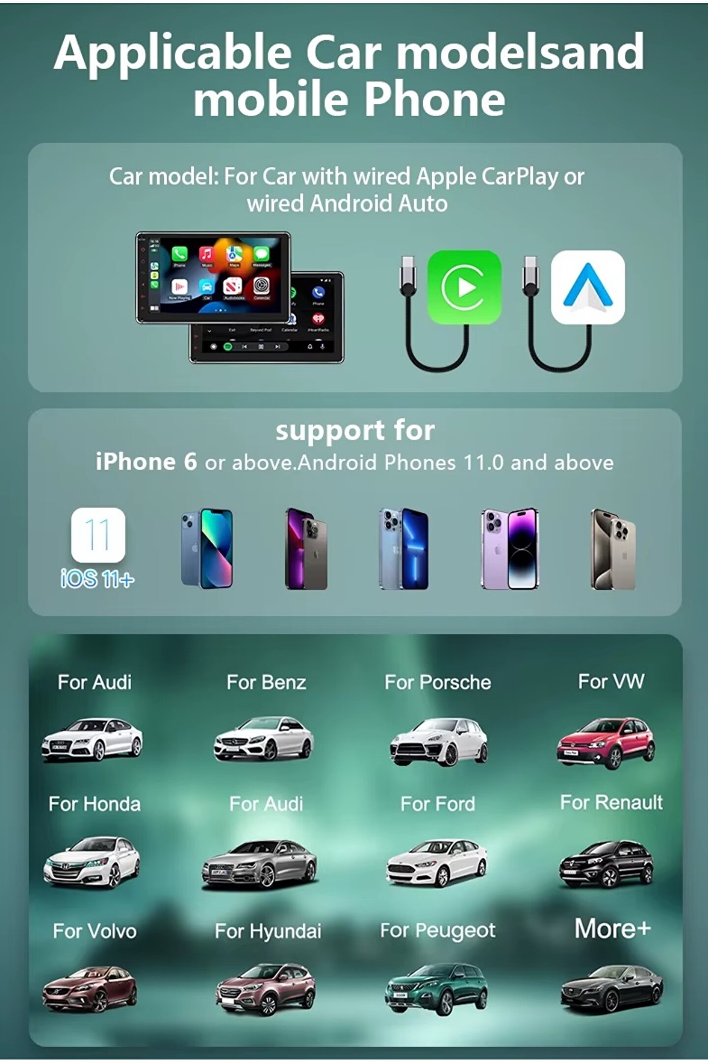 İşlemci ALLWINNER V851S WIFI modülü Trolink TL8800D0SB Güç girişi 5V 1A Güç çıkışı 5V 1A WIFI frekansı Destek 2.4G + 5.0G çift bant, 20/40MHz bant genişliği WLAN standardı IEEE 802.11b/g/n/ac/ax, Wi-Fi uyumlu Anten özellikleri Yerleşik anten Bluetooth sürümü 5.0 Bluetooth mesafesi 10m Çözünürlük Uyarlanabilir Uyumlu cep telefonu IPhone 6 ve üstü (iOS 10'dan daha yüksek sistem sürümü) Uyumlu araba bilgisayarı Dahili kablolu carplay ile modeller Gösterge ışığı LED ışık (her zaman mavi ışık, başarılı bağlantıdan sonra her zaman yeşil ışık) Kullanım yöntemi Tak ve çalıştır Ses kontrolü Destek Siri sesli asistanı WiFi şifresi 12345678 OTA IP adresi 192.168.1.101