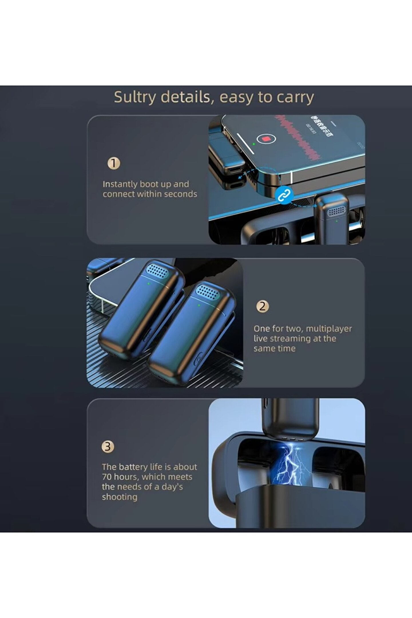 2.4G kablosuz teknolojiyi kullanarak, bu mikrofon kablosuz özgürlüğün tadını çıkarmanızı sağlayan anında bağlanır ve otomatik olarak çiftleşir. Bir sürükle iki tasarım, aynı anda yaşayan birden fazla insanı desteklemesine izin verir ve ekstra uzun pil ömrü, kayıt ihtiyaçlarınızı bir gün için tatmin eder.