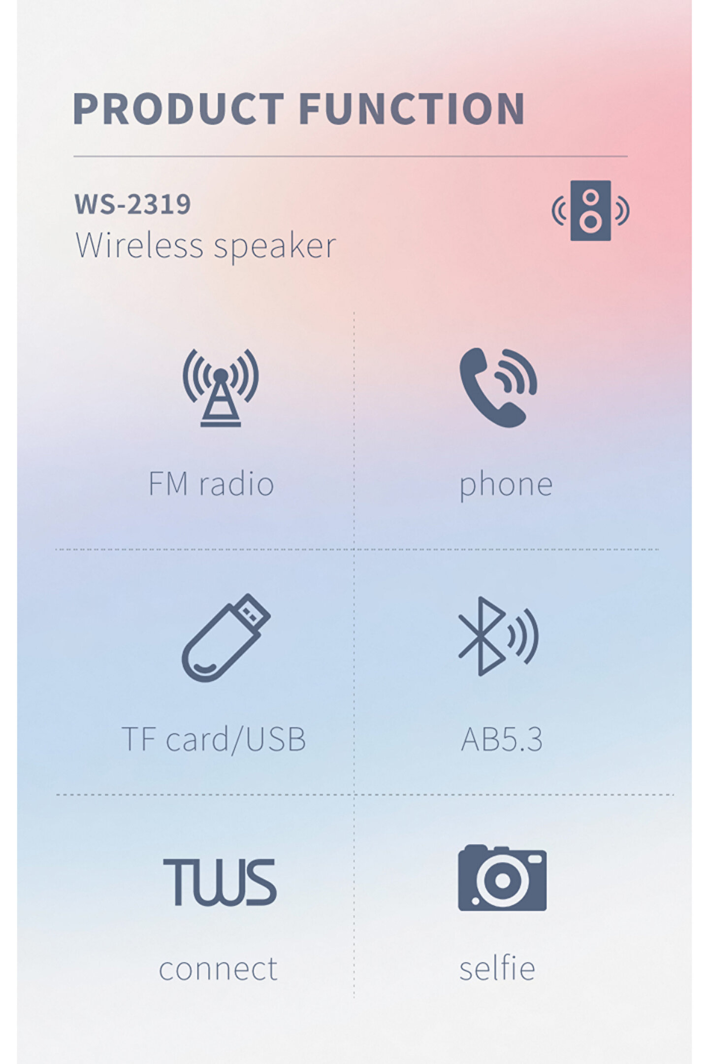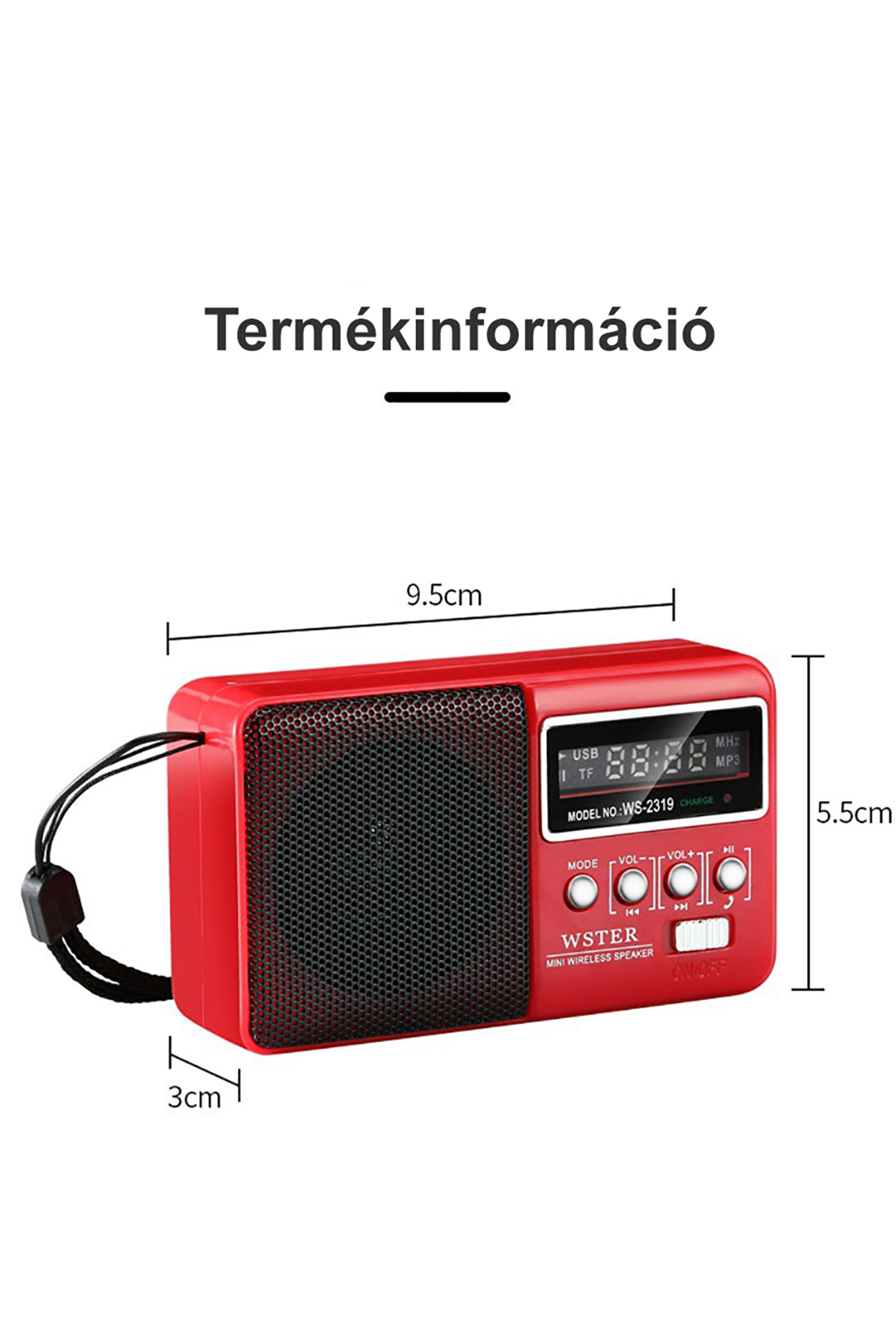 Ürün Detayları ; * Model numarası :WS-2319 * Özellikler: Bluetooth oynatma, TF kart U disk okuma, FM radyo, TWS, LED ekran * Çıkış gücü :1*3W * Hoparlör :45MM*1 * Şok modu: Yok * Pil :1*500 mah * Radyo: 88-108 FM * Bluetooth sürümü :AB5.3 * Renkler: Siyah, mavi, Kırmızı * Giriş voltajı :5V Ürün Açıklaması Müzik çalarken telefon görüşmelerini yanıtlamayı destekler Dahili FM radyo Tak-çalıştır tipi mini hoparlör USB/SD kartı destekler Masaüstü bilgisayarlar, akıllı telefonlar ve çeşitli cihazlarla uyumludur USB arayüz tasarımı, Bluetooth uyumlu cihazlarla tak ve çalıştır, kurulumu ve kullanımı kolay Kompakt ve hafif, taşınması kolay, klipsli cep radyosu İşlev: USB/SD kart Mp3 ses dosyasını oynat Harici ses girişi harici güç şarj arayüzü FM otomatik taramalı radyo Otodin sistemli hoparlör