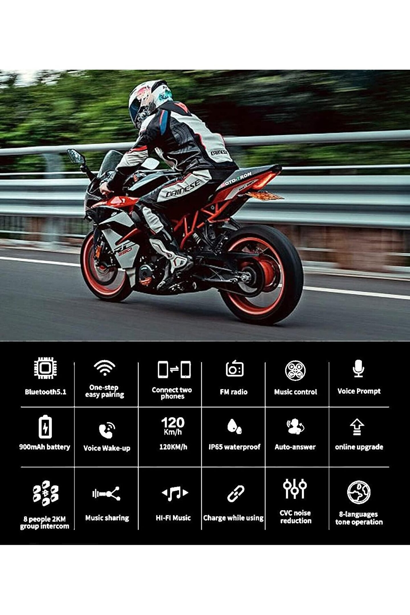 8 Yönlü Konferans İnterkomu ve Evrensel Eşleştirme QSPORTPEAK Shark08 motosiklet bluetooth kulaklığı, sürüş deneyimini paylaşır ve 1500 metrelik interkom aralığında (4 sürücü için en iyisi) aynı anda 8 sürücüye kadar konuşmanın keyfini çıkarır. Piyasadaki çoğu Bluetooth kulaklık veya kulaklıkla uyumlu evrensel eşleştirme özelliği. ?Eller Serbest Hoparlör ve Hi-Fi Stereo Ses Kalitesi QSPORTPEAK Shark08 motosiklet kaskı bluetooth, sürüş sırasında sizin için kolay eller serbest iletişim sağlar. Ayrıca Siri ve S Voice komutlarına erişim sağlayan Bluetooth 5.1 özelliğine sahipti; eller serbest çağrıları arayabilir veya cevaplayabilir, en iyi Hi-Fi stereo müziği, FM radyoyu dinleyebilir veya GPS sesli rehberliğini dinleyebilirsiniz. ?Müzik Paylaşımı ve Gürültü Önleme? Bu kask bluetooth kulaklık, iki sürücünün yolculukları sırasında aynı şarkının keyfini çıkarmasına olanak tanıyan müzik paylaşımı özelliğine sahipti. Ayrıca DSP ve CVC gelişmiş gürültü engelleme teknolojisiyle 120 km/saat'e kadar hızlarda da iyi çalışır. ?Değiştirilebilir Mikrofon ve Harika Kask Uyumluluğu QSPORTPEAK Shark08 motosiklet interkomunun iki adet değiştirilebilir mikrofonu vardır - açık yüz veya döner yüz (dönüştürülebilir) kasklar için bir bom mikrofonu veya tam yüz kaskları için bir düğme mikrofonu arasında seçim yapmanızı sağlar. ?IP65 Su Geçirmez Tasarım ve Uzun Pil Ömrü IP IP67 su geçirmez teknolojisine sahip QSPORTPEAK Shark08 kask iletişim sistemleri, tüm hava koşullarının üstesinden gelebilir. 900mAh dahili pil ve Type-C hızlı şarj arayüzü ile Shark08 powersports kask iletişim sistemi, yalnızca 2,5 saatte tamamen şarj edilebilir, 33 saat interkom, 28 saat müzik çalma ve 500 saat bekleme süresi sürebilir.