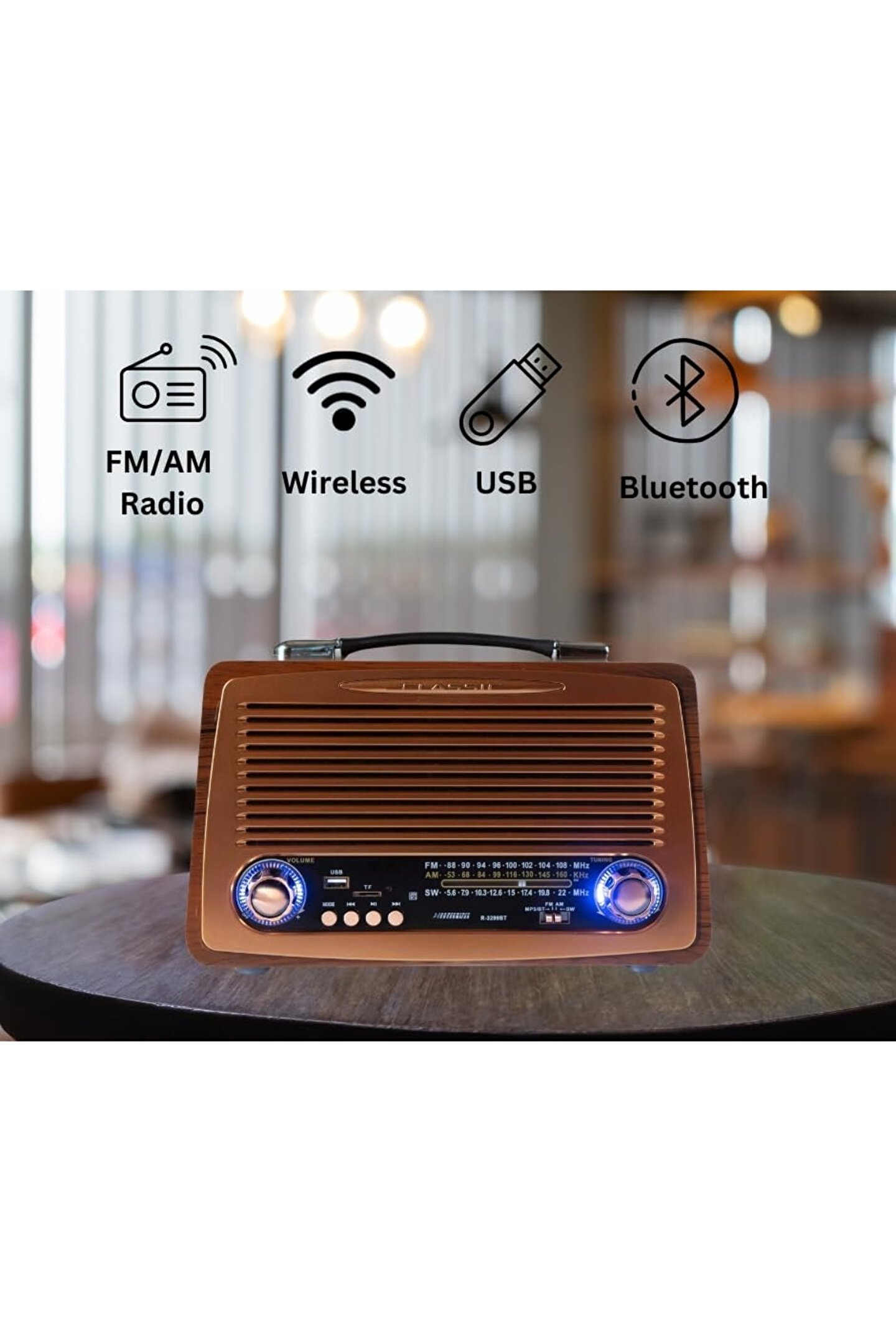 Ahşap Nostaljik Görünümlü Bluetooth Radyo, nostaljik ve modern özellikleri bir araya getirir.