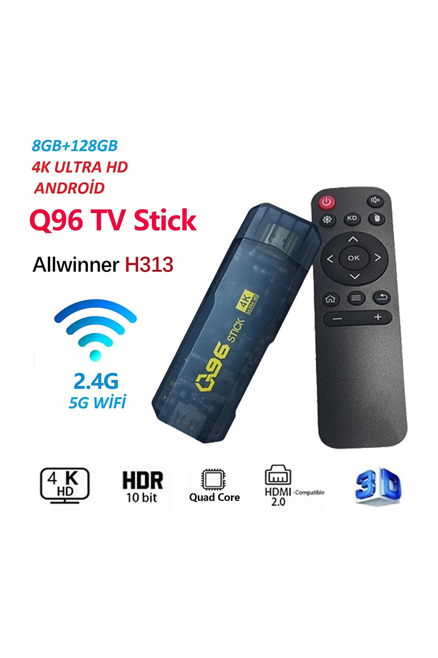 Bu ürün hakkında Android 10.0 işletim sistemi: Q96 Android TV Stick, Android 9.0'dan daha kararlı ve daha hızlı olan Android TV 10.0 işletim sisteminin güncellenmiş bir sürümüyle birlikte gelir.; Geliştirilmiş Android TV 10.0 sürümü, geniş uyumluluk sağlayarak birçok favori uygulamanızı kolayca yüklemenizi sağlar.; Dört çekirdekli AllWinner H313 işlemcisi sayesinde yavaş çalışma sorunları yaşamadan sorunsuz ve esnek bir şekilde çalışır.; ???3D & 4K & H.265?: Q96 TV Stick 4K, dahili profesyonel H.2654K@60fpsVP9 ile 3D video ve 4K - 2K UHD çıkışını destekler.; Kod çözme teknolojisi görüntüleri daha net bir şekilde işler.; Size gerçekçi bir bakış açısı sunar.; Güçlü özellikler ve heyecan verici 4K içerikler sunar.; Akıllı ve taşınabilir: Bu TV Stick küçük boyutludur ve yerden tasarruf sağlar.; TV'nizin arkasına gizlemeniz yeterlidir.; Ardından harici alıcıyı TV'nizin önüne çekin.; Kullanımı kolay.; Rahat giyilebilir, seyahatlerinizde otelde konaklarken veya iş seyahatlerinizde, toplantılarınızda ve ofis işlerinizde kullanabilirsiniz.; ???1 GB RAM ve 8 GB ROM?: 1 GB RAM, işletim sisteminin hızını ve kararlılığını sağlar.; Daha geniş depolama alanı, videoların daha hızlı yüklenmesini ve oyunların daha akıcı oynanmasını sağlar.; 8 GB ROM, en sevdiğiniz uygulamaları ve filmleri indirmek için daha fazla alan sağlar, böylece boş zamanlarınızın tadını çıkarabilirsiniz.;