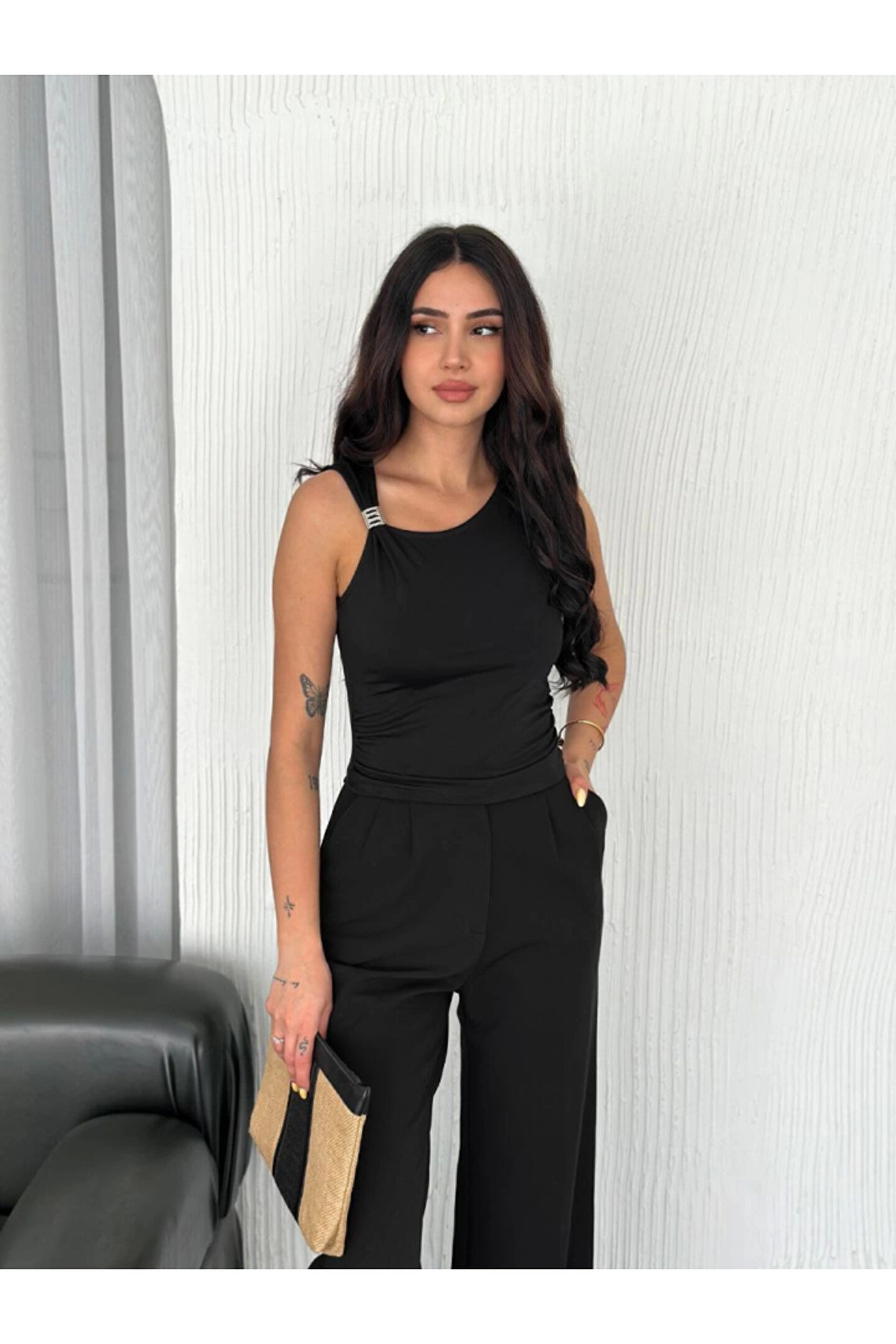 Osy Modal Yumuşak Dokulu Kumaş Bisiklet Yaka Sıfır Kol Bluz Omuz Toka Aksesuar Detaylı - Siyah