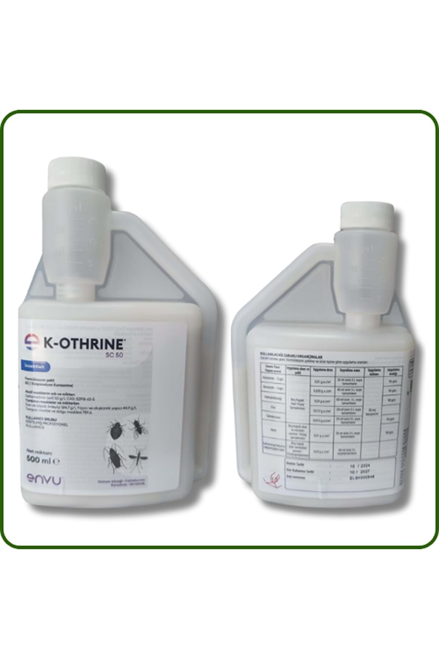Bayer K; othrine SC 50 Haşere İlacı Kullanım Alanları: Bayer K; othrine SC 50, SC Formül yapısı itibarıyla kokusuz leke bırakmayan ilaçlama esnasında ve sonrasında mekanı terk etmeyi gerektirmeyen sınıf ilaçlardandır; Buna bağlı olarak Ev, restaurant, lokanta, işyerleri, hastahane, askeriye vb kapalı ve iç mekanlarda kullanıma uygun olmasının yanında açık alanlarda da kullanılabilen başarısı yüksek genel amaçlı haşere ilacıdır; Kullanılacak mekanın türüne ve ilaçlama sıklığına göre ambalaj tercihi yapabilirsiniz; Genel Özellikleri: Sinek Sivrisinek benzeri uçkun haşerelerle birlikte özellikle hamamböceği, kalorifer böceği, bit, pire, tahtakurusu, karınca vb yürüyen haşereler üzerinde, güçlü sc formülasyonuyla ani düşürücü etkili yeni kuşak haşere ilacıdır; Suyla seyreltilebilmesi ve buharlaşmayan süspansiyon olması sebebiyle, HALK SAĞLIĞI ilaçları kapsamında, kullanımı ve uygulaması oldukça kolay başarılı bir formüldür; Sıkıldığı yerde ortalama tutunma süresi 10 hafta olduğu için uzun vadeli kalıcılığıyla ve böcekler üzerinde ani düşürücü etkisi ile en yüksek performansı alabileceğiniz bir üründür; 50ml'lik minik bir konsantre şişe, yaklaşık 4; 5 litre suyla seyreltilerek kullanıldığı için maliyet oldukça düşük olmaktadır; Buharlaşmayan yapısı ve zemin tarafından emilmeyen süspansiyon yapısıyla, ev ve işyeri, ofis uygulamalarında ideal ürünlerdendir; Geniş haşere spektrumu sebebiyle bir çok böcek cinsine karşı etkili olması, birkaç sorunu bir uygulamada ortadan kaldırma imkanı verir; Ürün kullanma kılavuzunda, hangi haşere için ne miktar ve ne şekilde uygulamanız gerektiğini bulabilirsiniz; Litrede 50 g; saf Deltamethrin;;