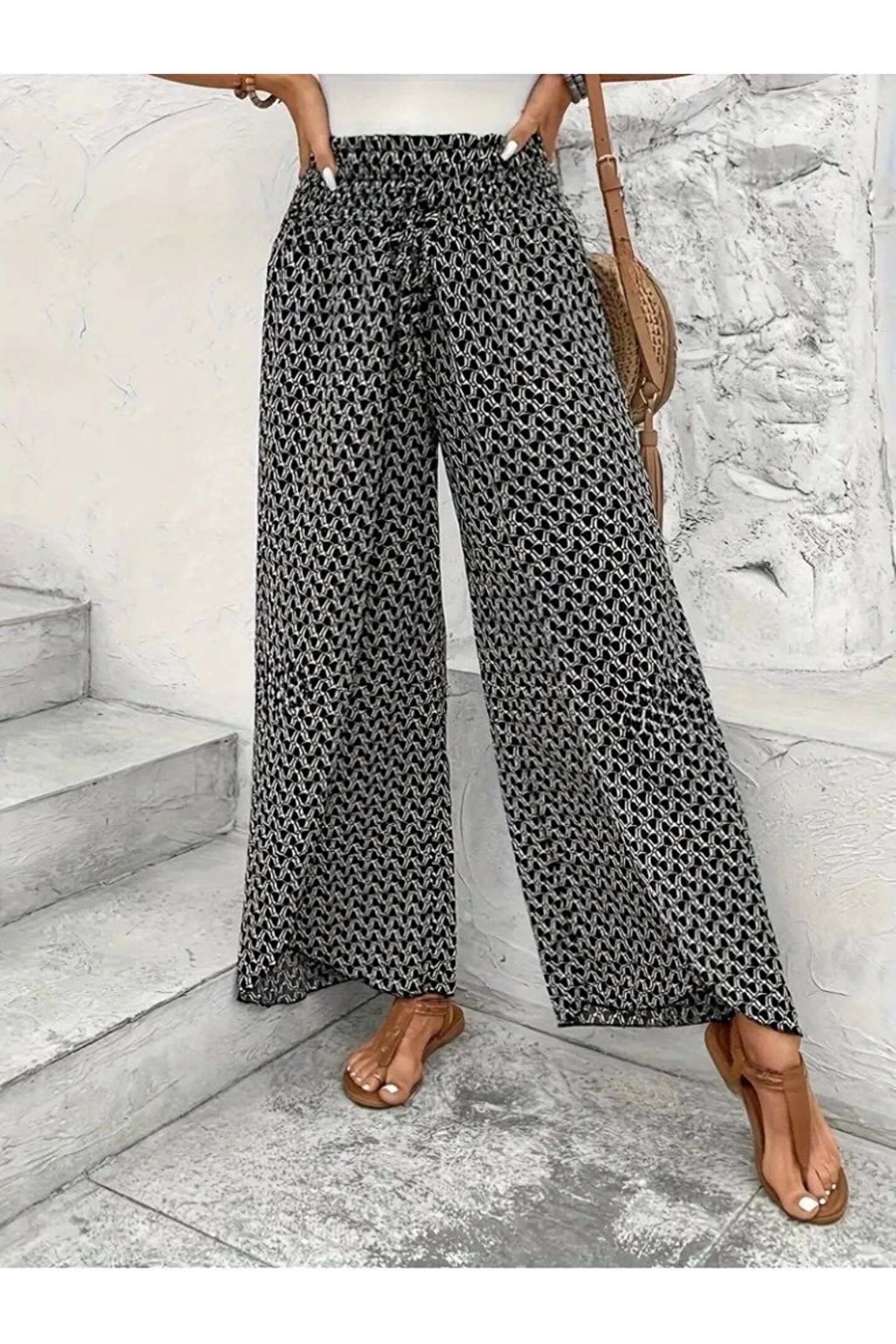 Kadın Yüksek Bel Lastikli önden Iki Parçalı Desenli Bürümcük Pantolon