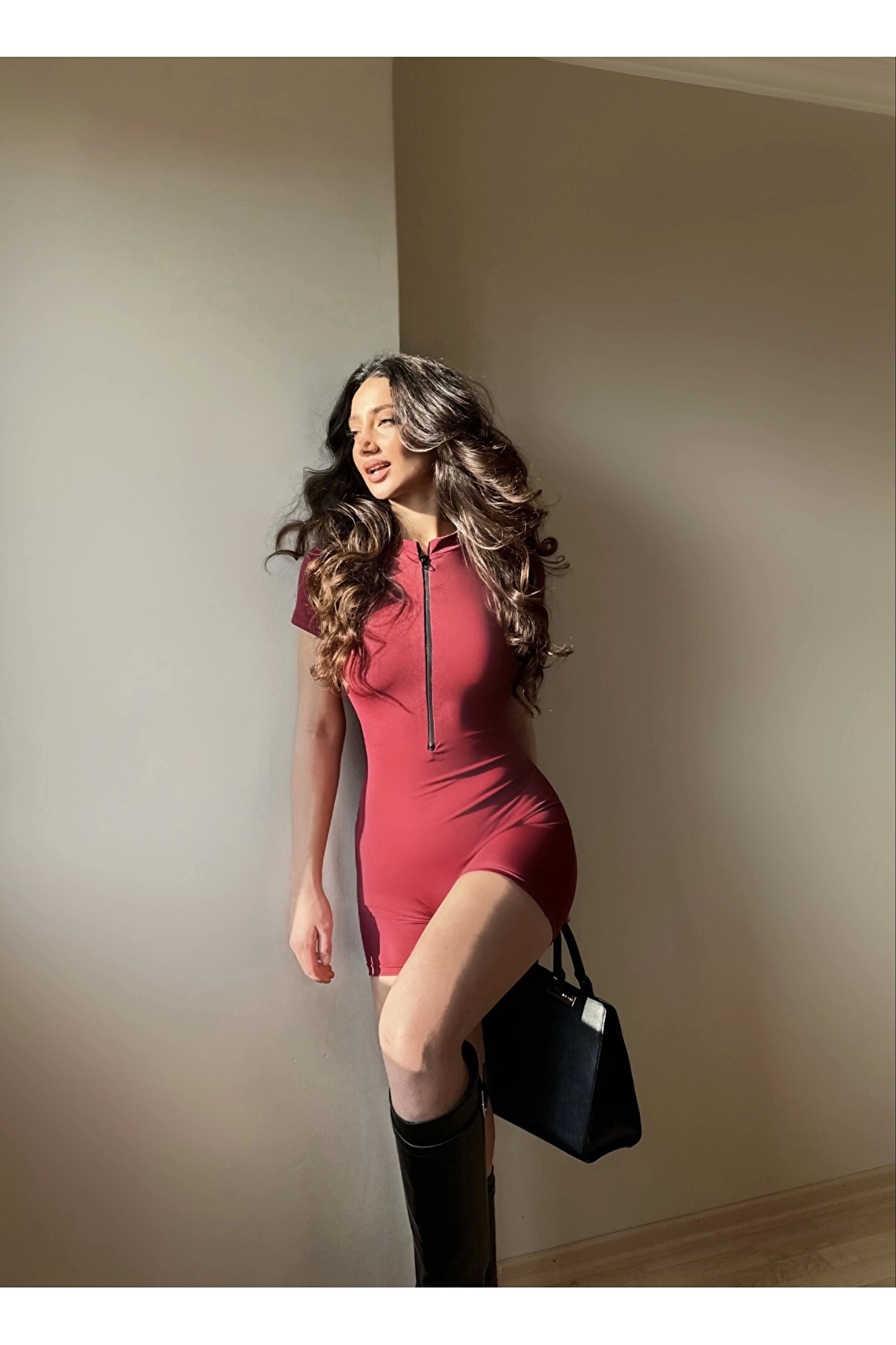 Bordo Fermuarlı Şort Tulum