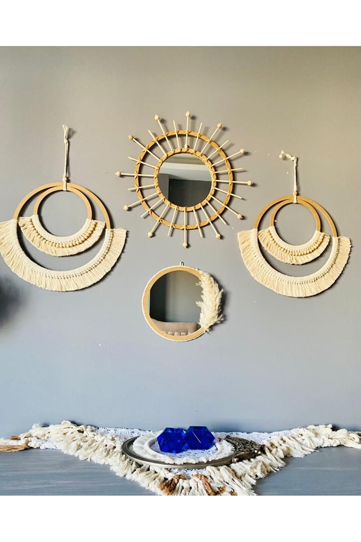 Makrome Bambu Ve Ahşap Ayna Duvar Dekorasyon Ürünü 4’lü Set