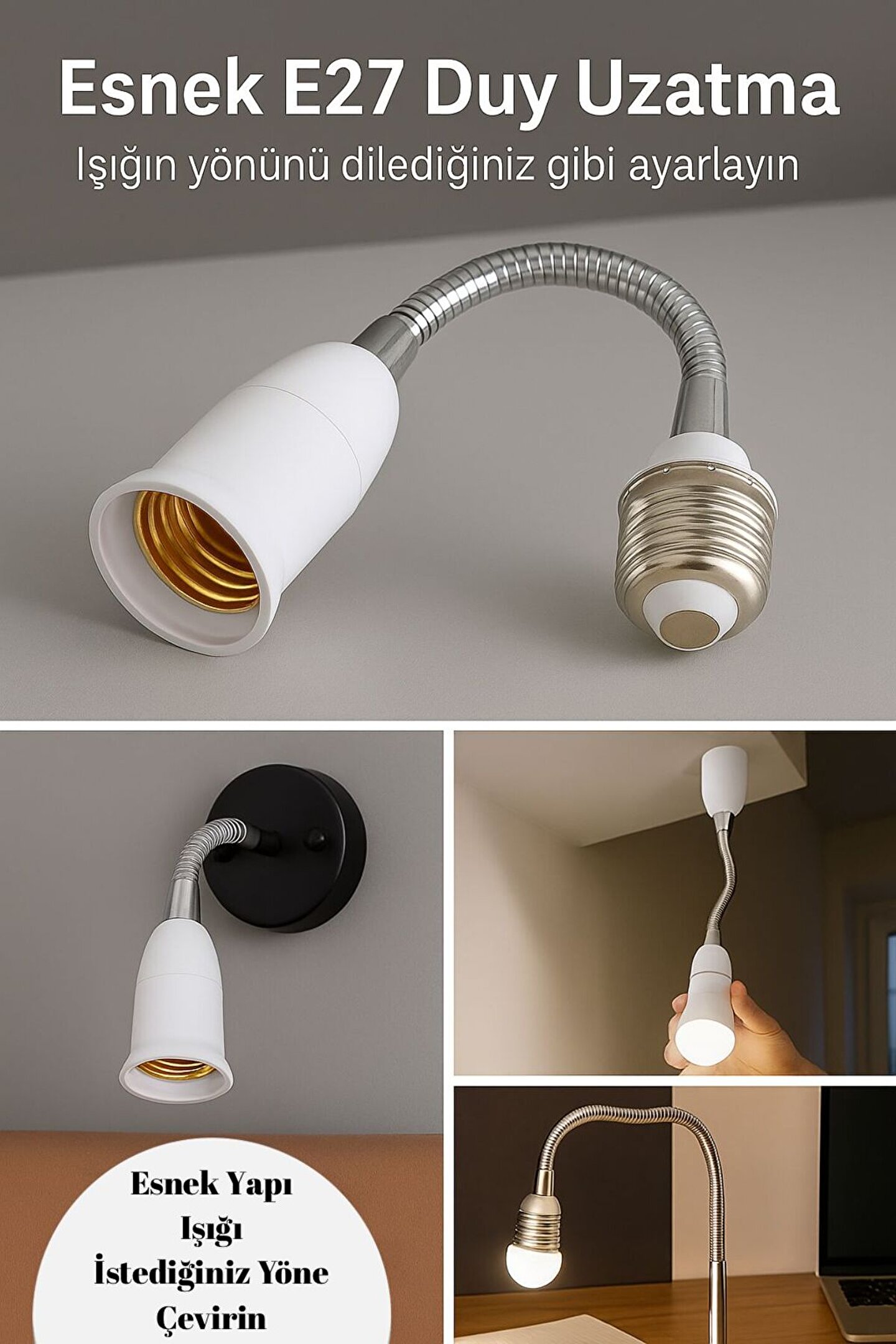 - 360 derece esnek yapısı sayesinde, farklı açılarda kullanım imkanı sunar.; - Bükülebilir tasarımı ile duvarlara veya köşelere kolayca monte edilebilir.; - E27 duy tipine uygun olması, geniş bir ampul seçeneği sunarak kullanıcıya esneklik sağlar.; - Menşei Türkiye'den gelen bu ürün, yerli üretim kalitesini yansıtır.