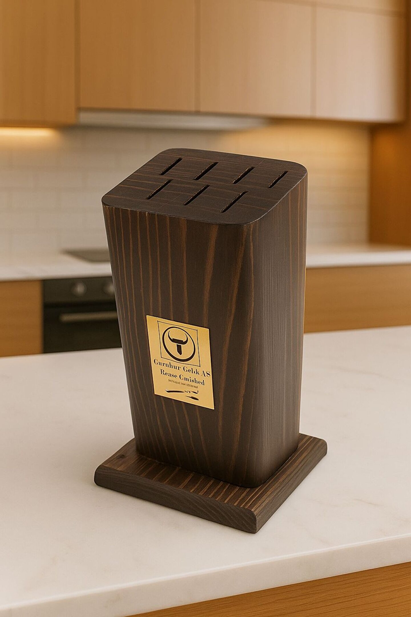 Mutfakta düzeni ve estetiği bir araya getiren bu öne eğimli ahşap bıçak standı, hem şık görünümüyle hem de fonksiyonelliğiyle öne çıkıyor.; 7 adet bıçak yuvası sayesinde mutfak bıçaklarınızı güvenli ve düzenli şekilde saklayabilirsiniz.; Masif ahşap gövdesi ile sağlam ve uzun ömürlü kullanım sunar.; Siyah tezgah üzerinde şık bir mutfağın tamamlayıcısı olarak öne çıkan bu stand, modern ve klasik mutfaklara uyum sağlar.; ; Ürün Özellikleri: •7 bıçak yuvalı kompakt tasarım •Öne doğru eğimli ergonomik yapı •Dayanıklı ve kaliteli ahşap malzeme •Kaymaz ve sağlam taban •Şık mutfaklara uyumlu modern görünüm