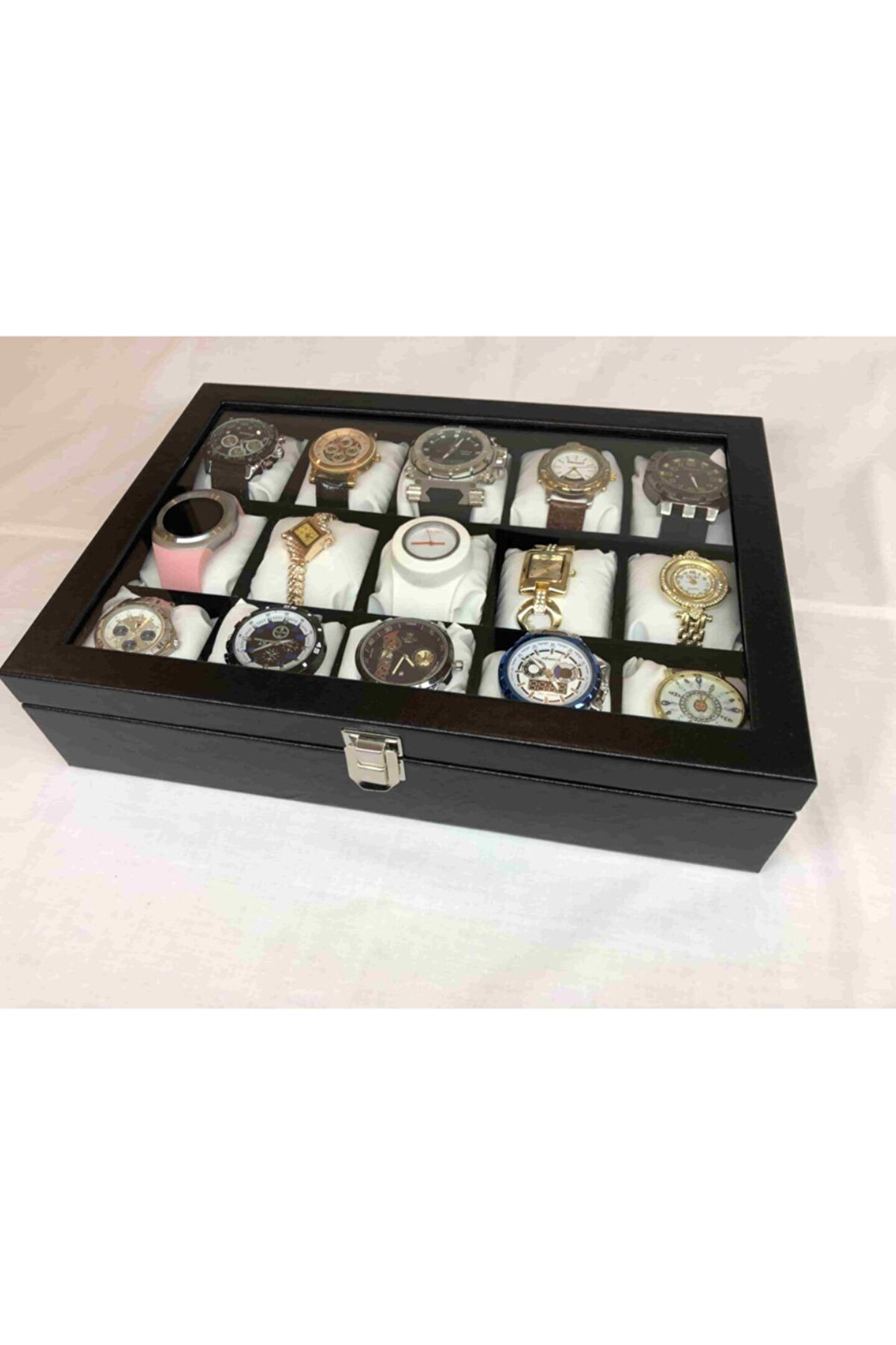 Camlı Ahşap Deri Kaplama 15 Bölmeli Mat Siyah Desensiz Deri Saat ve Takı Kutusu