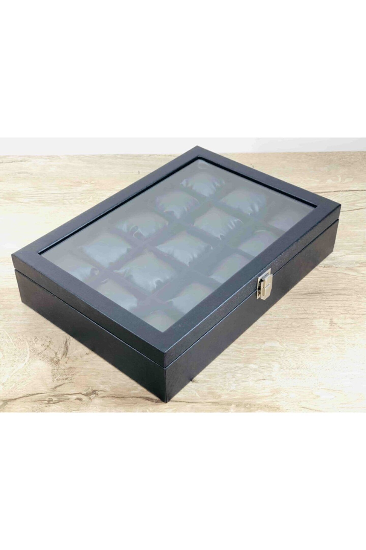 Çok Amaçlı Cam Kapaklı Ahşap İtalyan Siyah Deri Kaplama 15 Bölmeli Saat ve Takı Kutusu