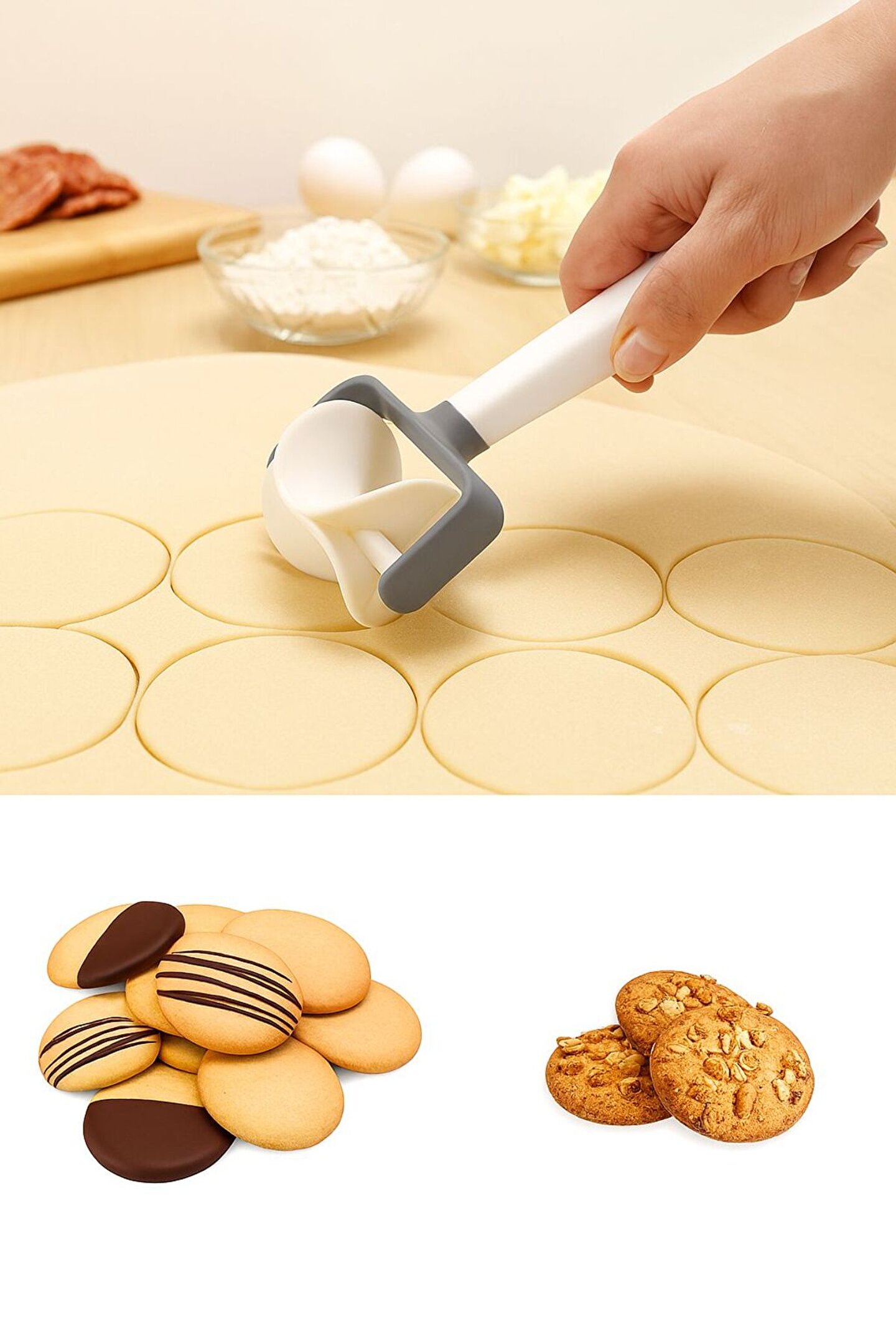 Kurabiye, hamur işleri ve poğaça yapımında kolaylık sağlayan döner başlıklı kesici rulo ile hamur kesmek artık zahmetsiz! Ergonomik tutma sapı sayesinde el yormaz, döner başlığı ile pürüzsüz ve eşit daireler elde etmenizi sağlar.; Mutfakta pratiklik arayan herkes için ideal bir yardımcıdır.; ; ⸻ Öne Çıkan Özellikler: •Döner başlıklı tasarım •Pratik ve hızlı hamur kesimi •Eşit boyutta yuvarlak şekiller oluşturur •Kurabiye, mantı, poğaça için uygundur •Kolay temizlenebilir malzeme •Ergonomik sap ile rahat kullanım
