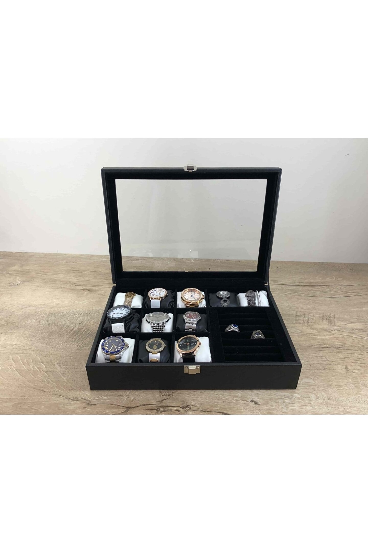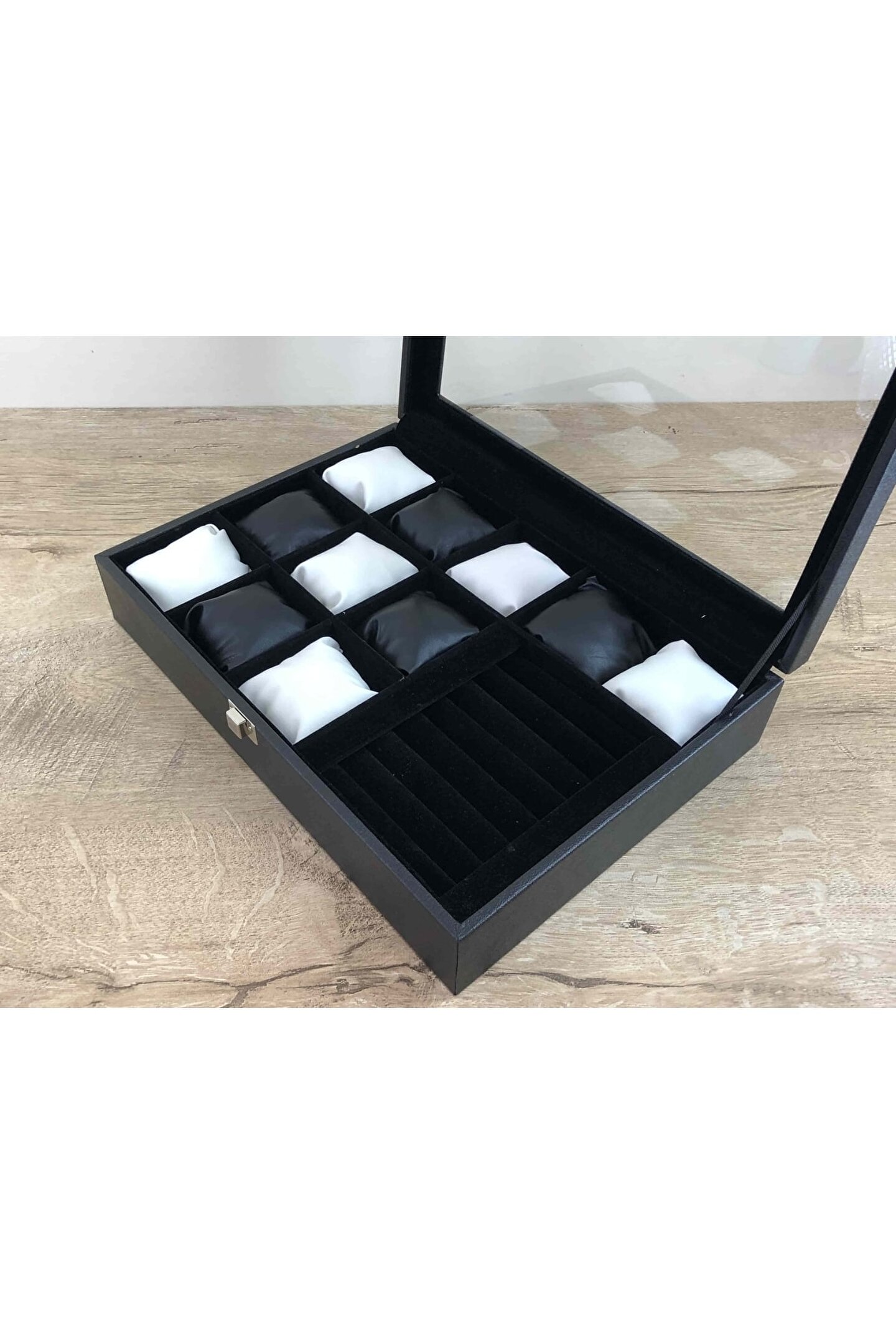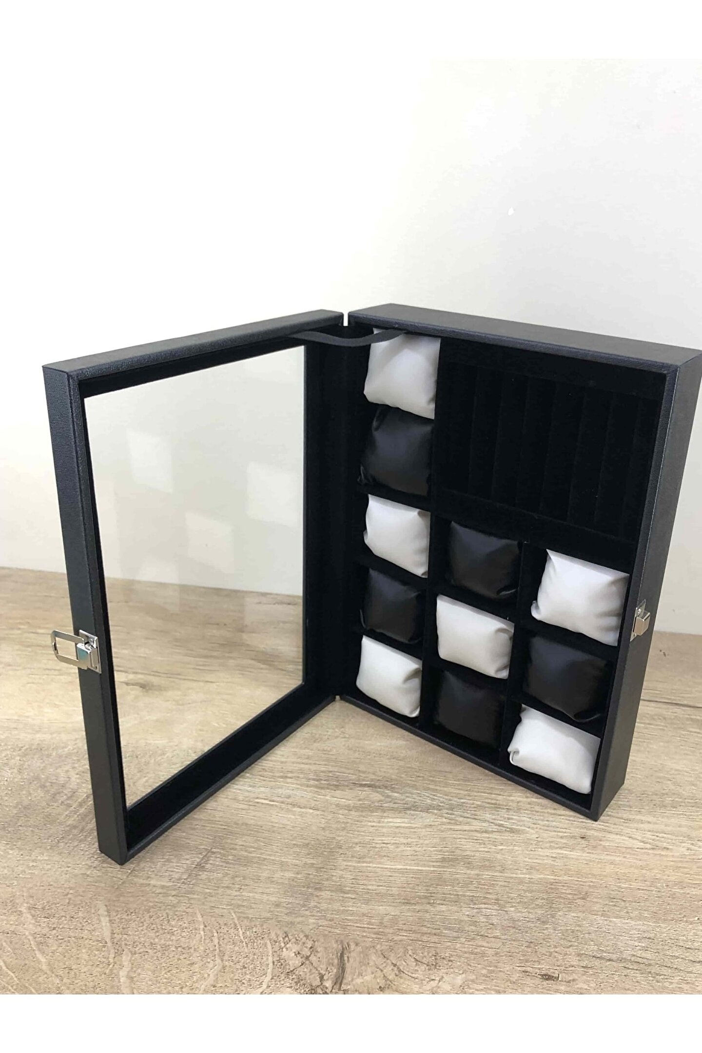 11 Bölmeli Özel Üretim Deri Görünümlü El Yapımı Camlı Görsel Kol Saati Bileklik Kolye Yüzük Taki Alyans Kutusu Display Stand %100 Orjinal Türk Malıdır Türkiyede Üretilmiştir Çin Malı Değildir İmalattan Halka Satış Tamamen El Yapımıdır 11 adet Büyük Boy Gözlüdür 7 Sıra Özel Yüzük ve Takı Bölümü Özel Üretim Deri Görünümlü Vinlex Kaplama 11 Adet Beyaz Vinlex Kaplama Yastık Silikon Dolgulu Yumuşak yastıklar Her Boyuttaki Saatlere Kolaylıkla Uyar Spor ve Klasik Saatler için Uygundur Bayan ve Erkek Modellerine Uyumludur BOYUTLARI : Dış Kutu Boy : 241mm Dış Kutu En : 341mm; Dış Kutu Yükseklik : 81mm; İç Göz Boy : 7; 1mm; İç Göz En : 6; 1mm; İç Göz Yükseklik : 7; 1mm; İç Takı Yüzük Bölümü Boy : 149mm; İç Takı Yüzük Bölümü En : 95mm; İç Takı Yüzük Bölümü Yükseklik : 45mm; Kilit En : 25mm; Kilit Boy : 32mm; Mentese Boy : 18mm; Mentese En : 21mm; Resimler Orjinal kendi çekimlerimizdir Resimdeki Saat Kutusu Gönderilicektir Ürünlerin Hepsi Stoklarımızda Mevcuttur Ana Gövde : 5mm; Ahşap Gövde Üstü : 2mm Mukavva İç Kaplama : Özel Tüy Dökmez Siyah Kadife Yastıklar : Siyah & Beyaz Yumuşak ince Vinlex Yastık Dolgu : Beyaz Yumuşak Silikon Dış Kaplama : PU Leather Vinlex Cam : 1; 8mm Kalınlık Kilit : Metal Menteşe : Metal DİĞER ÜRÜNLERİMİZE BAKMANIZI TAVSİYE EDERİZ;