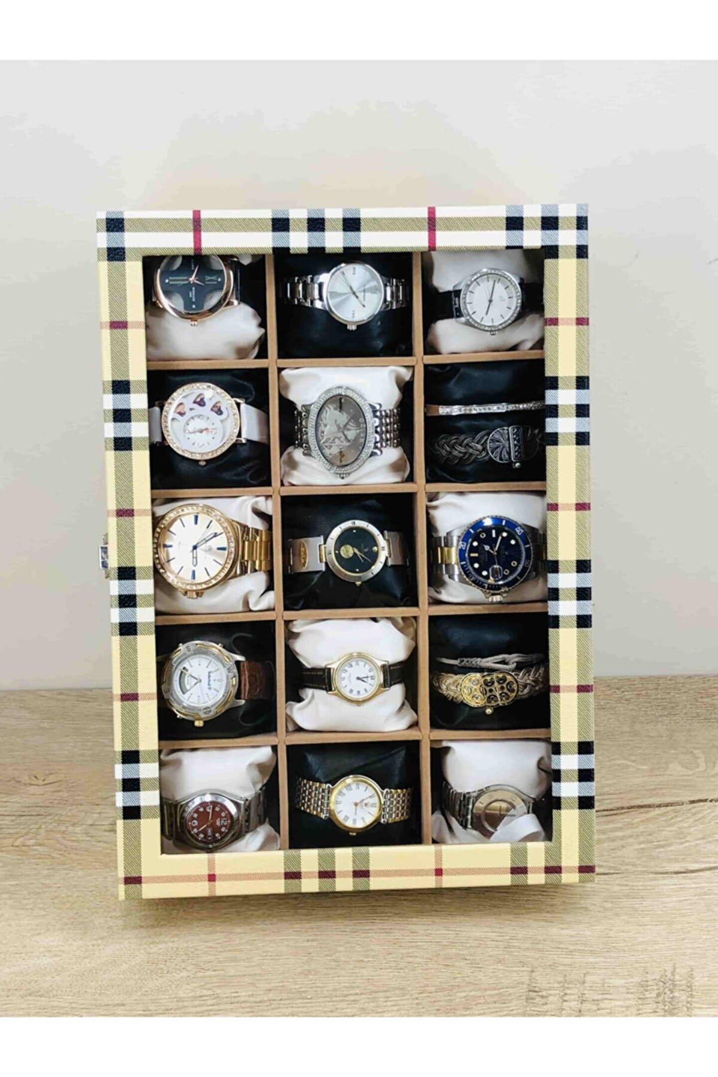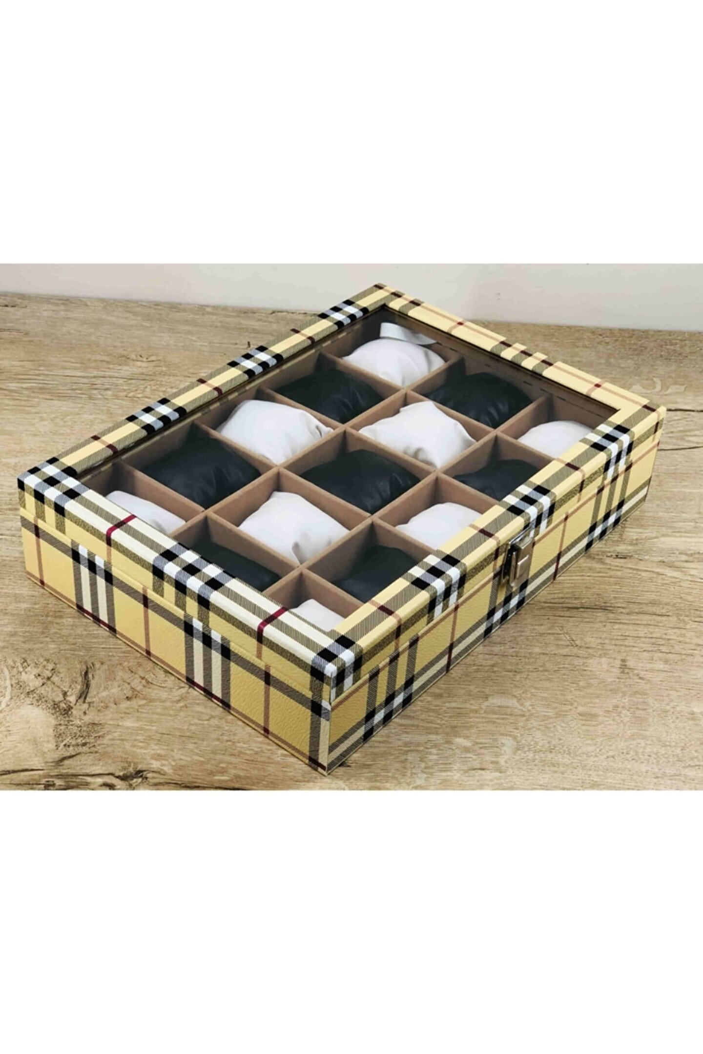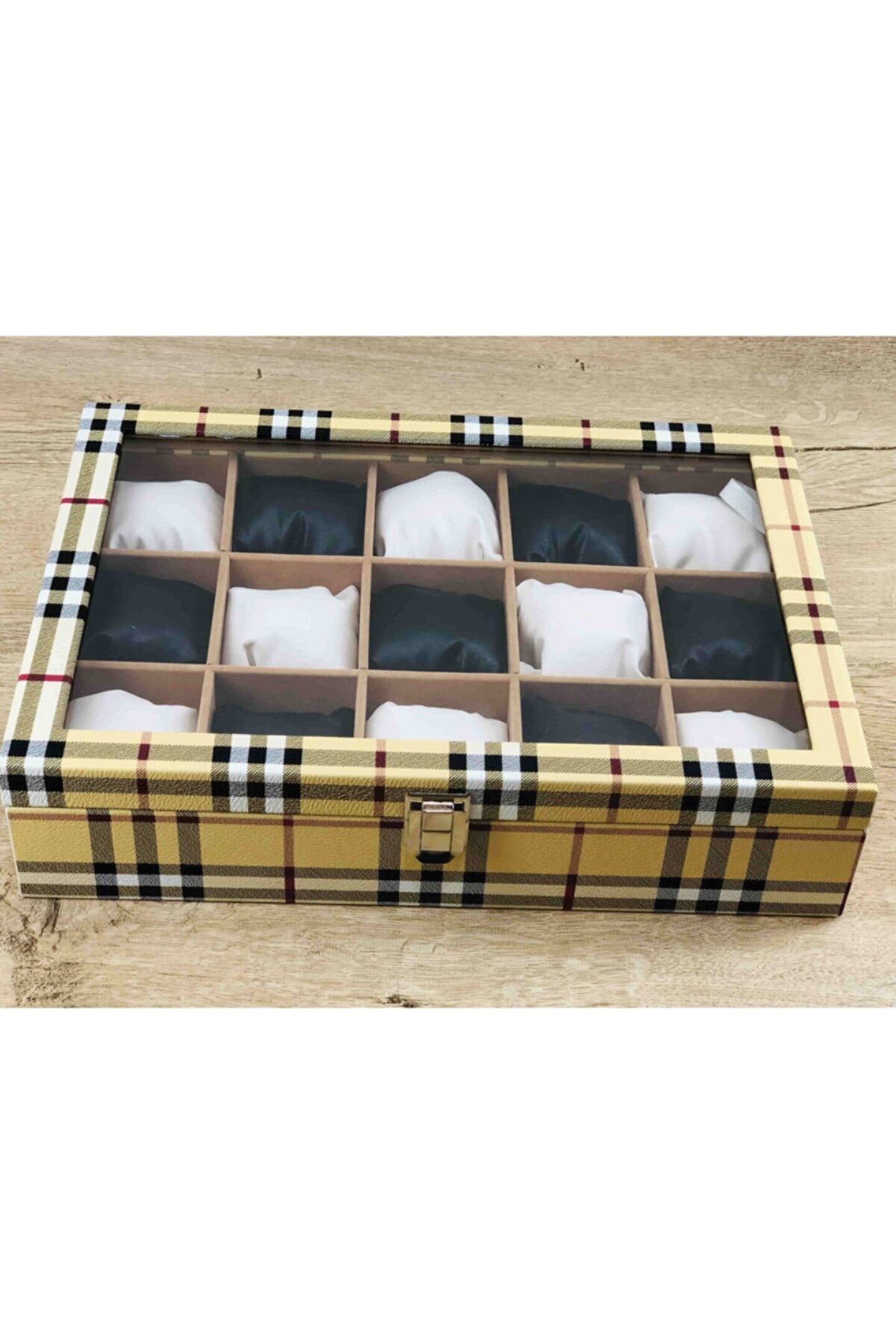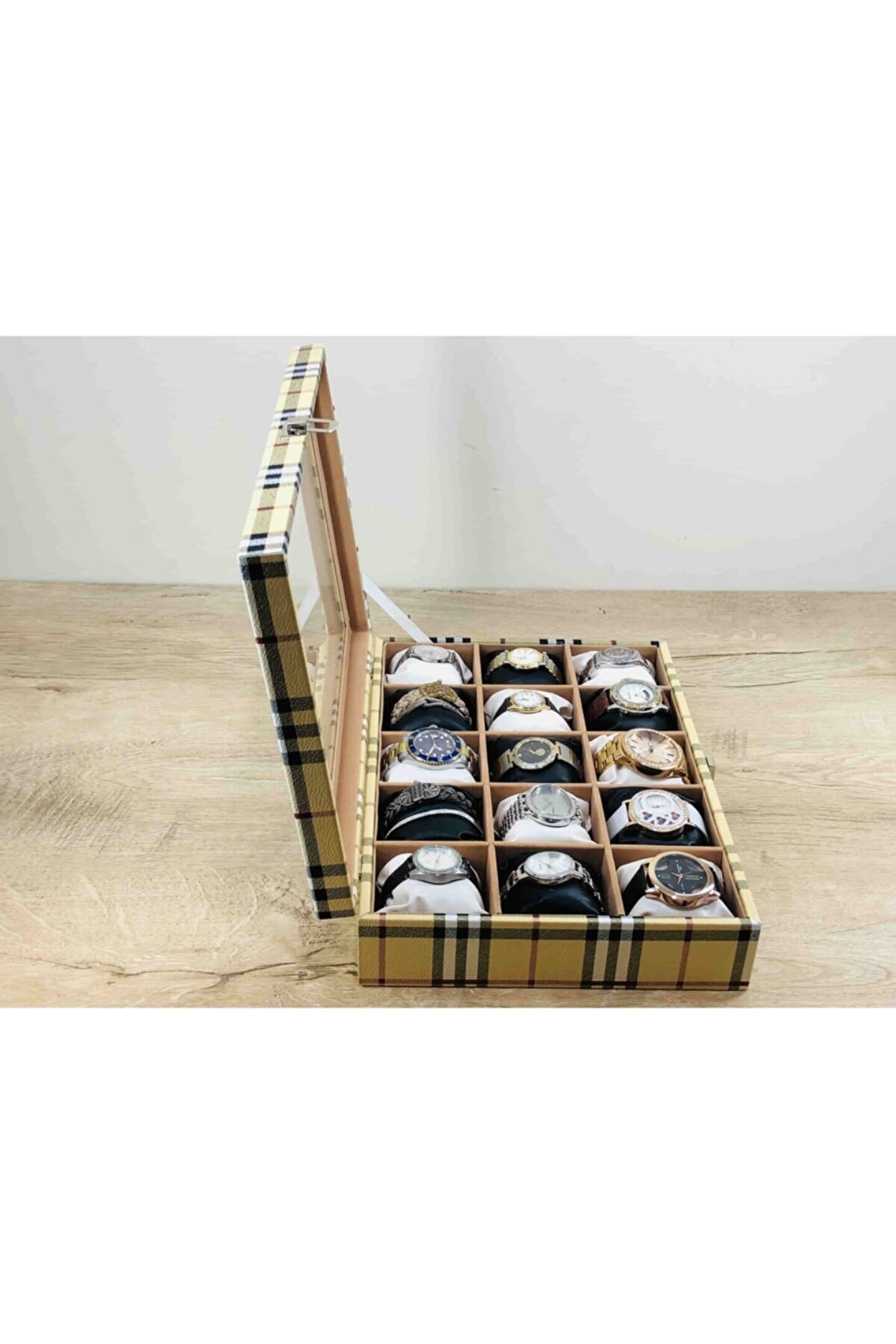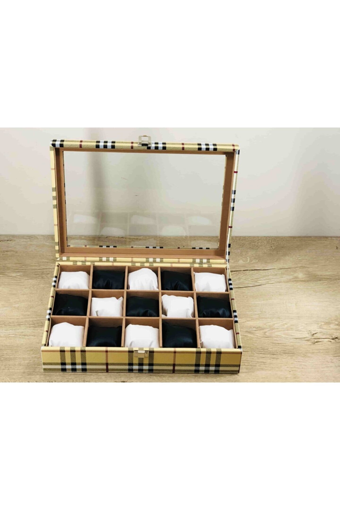 %100 Orijinal Türk Malıdır Türkiye'de Üretilmiştir Çin Malı Değildir İmalattan Halka Satış Fabrikasyon Yapımı Değildir Tamamen El Yapımıdır 15 adet Büyük Boy Gözlüdür 15 Adet Siyah Bayez Vinlex Kaplama Yastıklar Silikon Dolgulu Yumuşak yastıklar Her Boyuttaki Saatlere Kolaylıkla Uyar Spor ve Klasik Saatler için Uygundur Bayan ve Erkek Modellerine Uyumludur Yurt Dışına Gönderim ve İmzalı Teslimat vardır BOYUTLARI : Dış Kutu Boy : 241mm Dış Kutu En : 341mm. ; Dış Kutu Yükseklik : 81mm. ; İç Göz Boy : 7.1mm. ; İç Göz En : 6.1mm. ; İç Göz Yükseklik : 7.1mm. ; Kilit En : 25mm. ; Kilit Boy : 32mm. ; Mentese Boy : 18mm. ; Mentese En : 21mm. ; Resimler Orjinal kendi çekimlerimizdir Resimdeki Saat Kutusu Gönderilicektir Ürünlerin Hepsi Stoklarımızda Mevcuttur Stoktan Aynı gün Anlaşmalı Kargo ile Adresinize Gönderilmektedir Ana Gövde : 5mm. ; Ahşap Gövde Üstü : 2mm Mukavva İç Kaplama :;