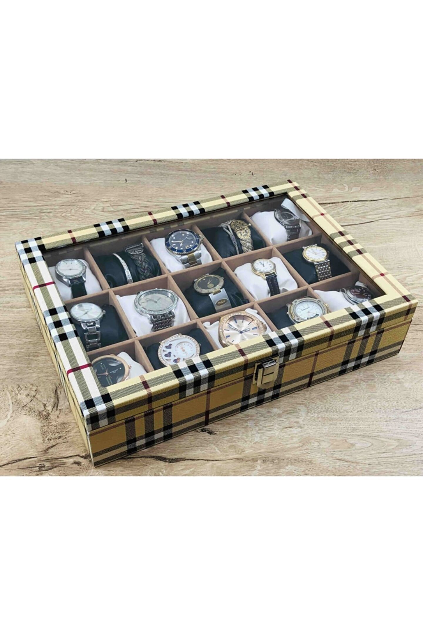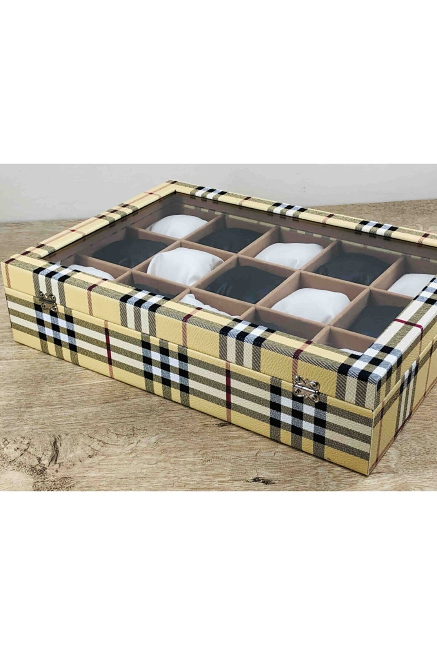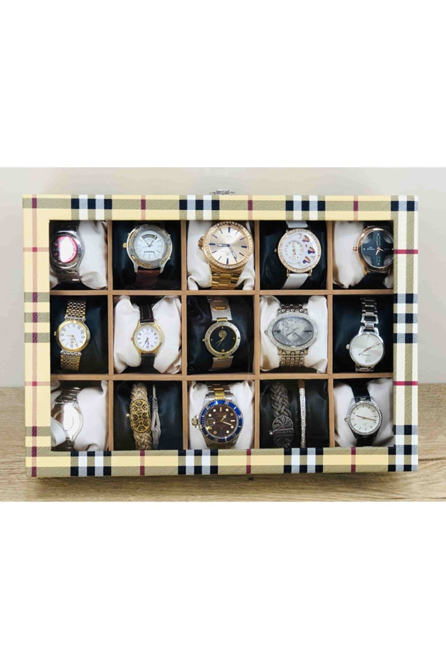 %100 Orijinal Türk Malıdır Türkiye'de Üretilmiştir Çin Malı Değildir İmalattan Halka Satış Fabrikasyon Yapımı Değildir Tamamen El Yapımıdır 15 adet Büyük Boy Gözlüdür 15 Adet Siyah Bayez Vinlex Kaplama Yastıklar Silikon Dolgulu Yumuşak yastıklar Her Boyuttaki Saatlere Kolaylıkla Uyar Spor ve Klasik Saatler için Uygundur Bayan ve Erkek Modellerine Uyumludur Yurt Dışına Gönderim ve İmzalı Teslimat vardır BOYUTLARI : Dış Kutu Boy : 241mm Dış Kutu En : 341mm; Dış Kutu Yükseklik : 81mm; İç Göz Boy : 7; 1mm; İç Göz En : 6; 1mm; İç Göz Yükseklik : 7; 1mm; Kilit En : 25mm; Kilit Boy : 32mm; Mentese Boy : 18mm; Mentese En : 21mm; Resimler Orjinal kendi çekimlerimizdir Resimdeki Saat Kutusu Gönderilicektir Ürünlerin Hepsi Stoklarımızda Mevcuttur Stoktan Aynı gün Anlaşmalı Kargo ile Adresinize Gönderilmektedir Ana Gövde : 5mm; Ahşap Gövde Üstü : 2mm Mukavva İç Kaplama :;