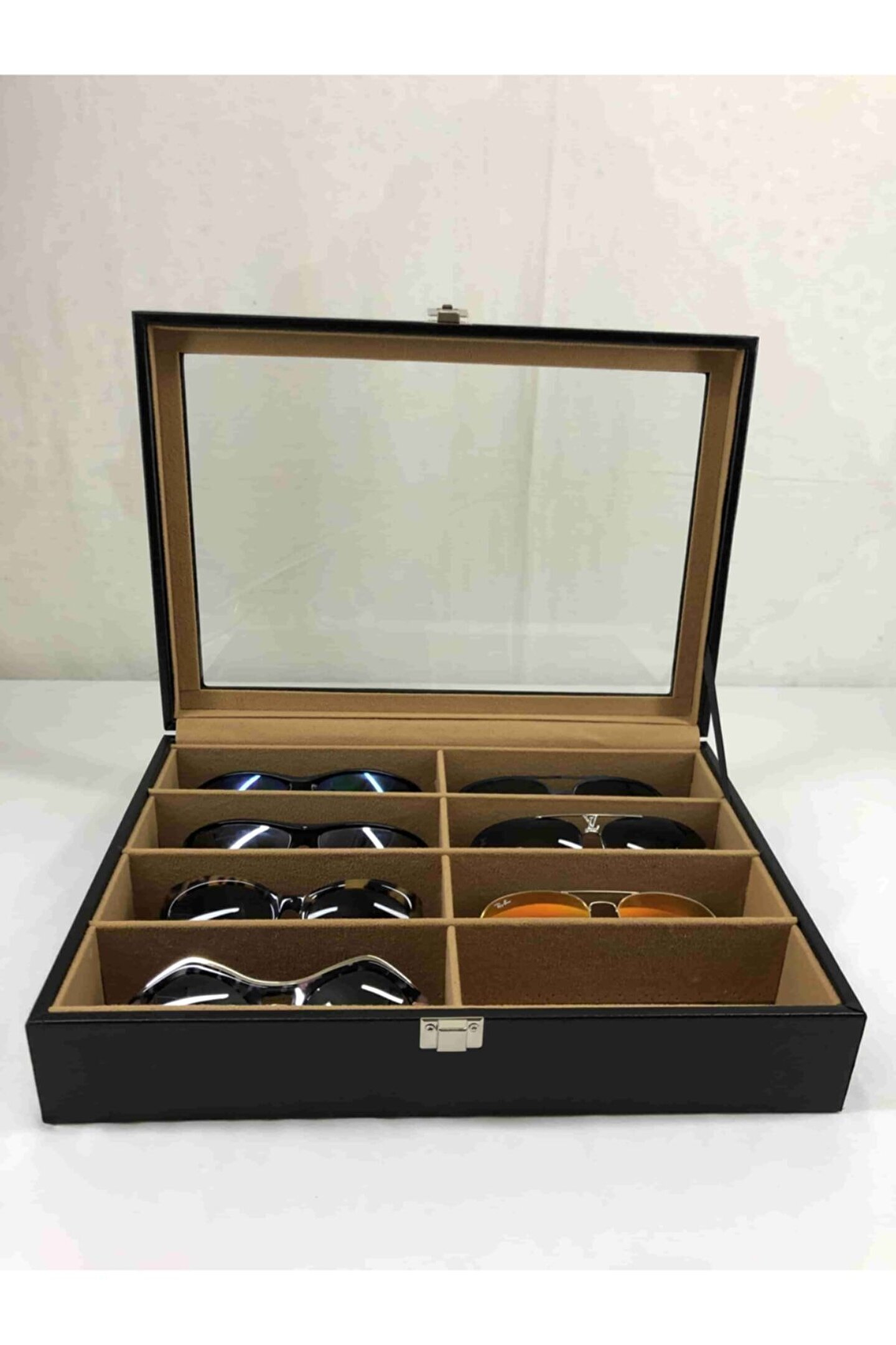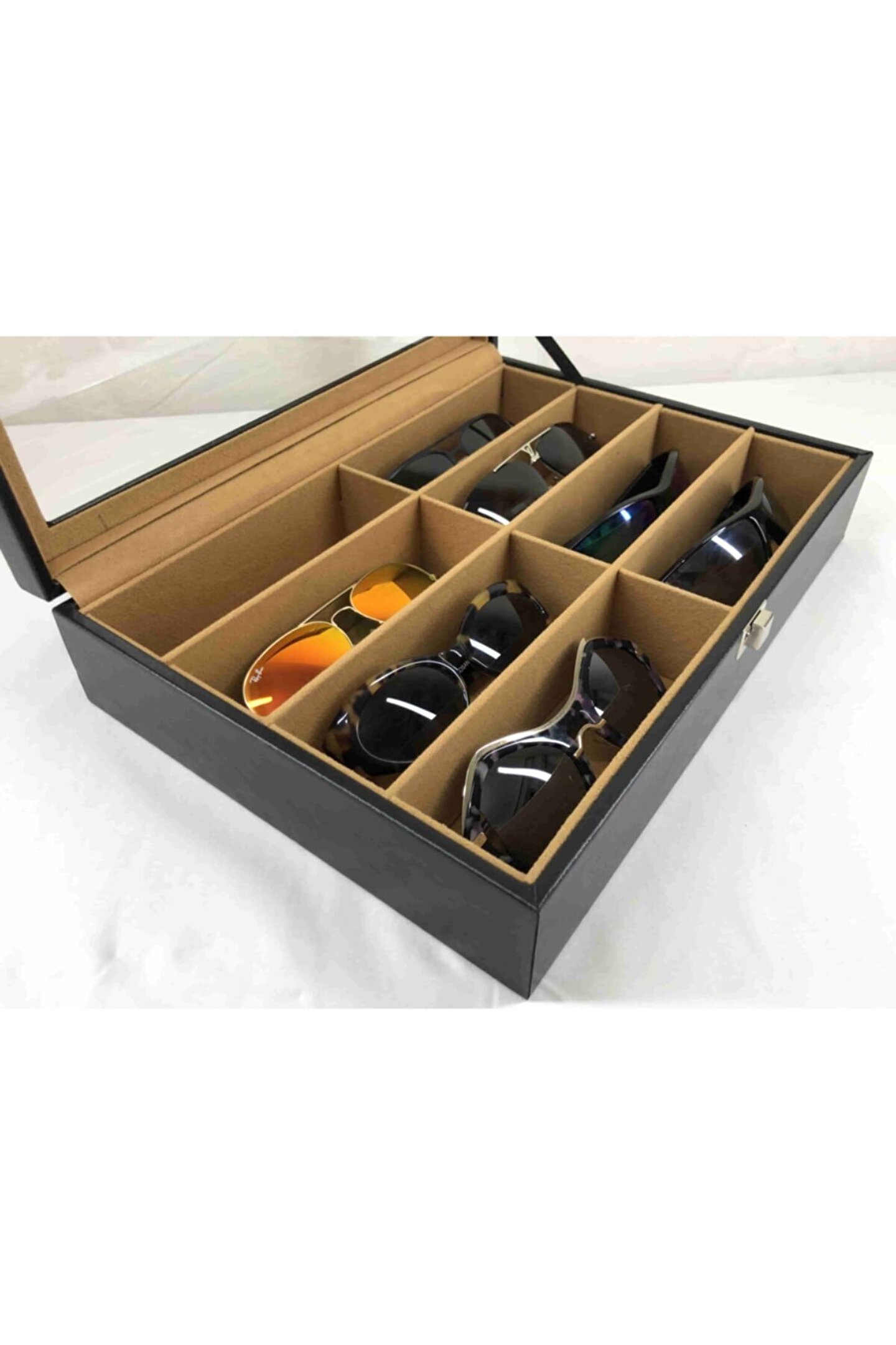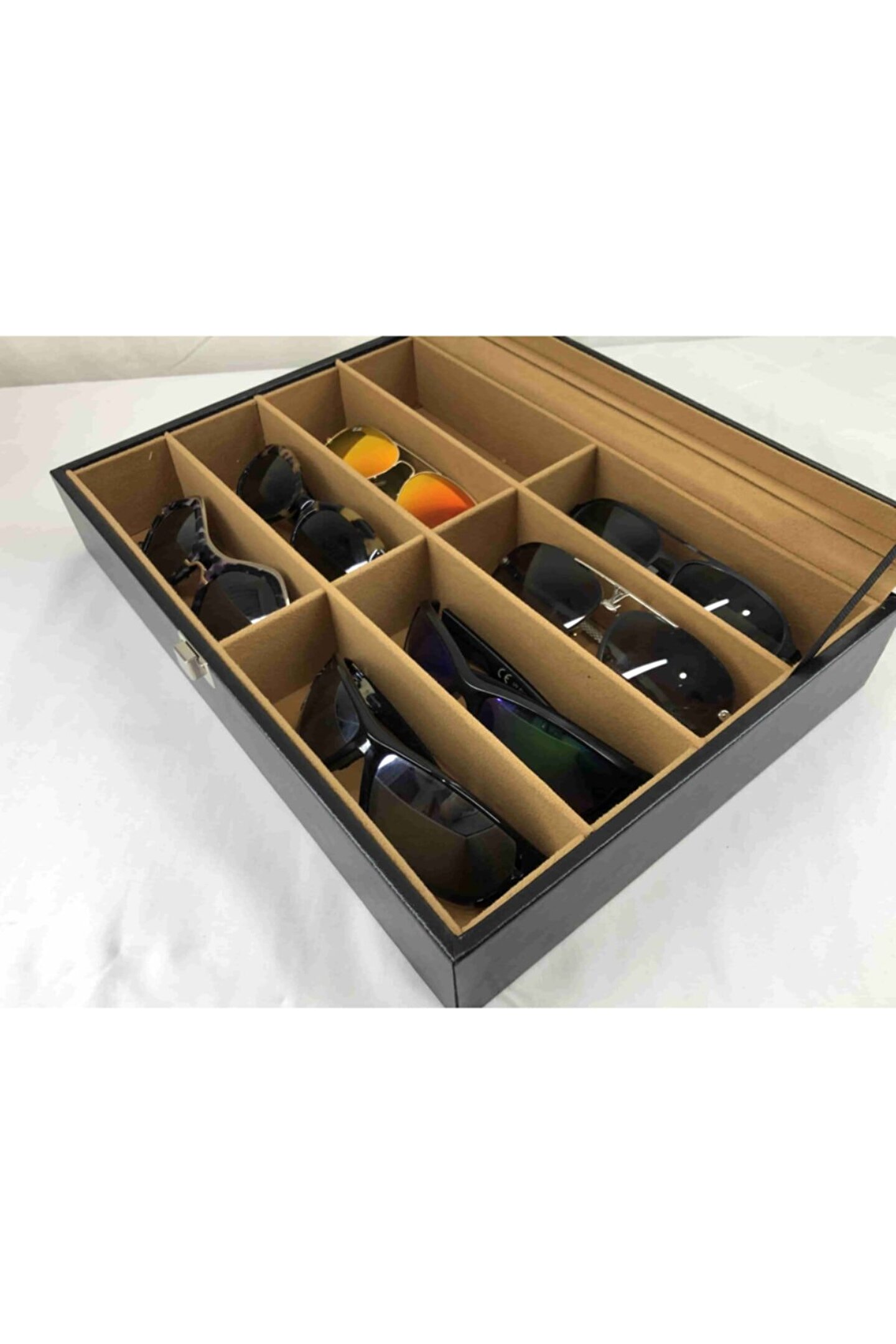 8 adet gözlük saklama bölüm bulunan özel el yapımı saklama kutusu Iç kısmı kahverengi kadife kaplı Dış kısmı siyah deri kaplama %100 orijinal türk malıdır Türkiye de üretilmiştir Çin malı değildir Imalattan halka satış Tamamen el yapımıdır Spor ve klasik gözlüükler için uygundur Boyutları : Dış kutu boy : 241mm Dış kutu en : 341mm. ; Dış kutu yükseklik : 81mm. ; Kilit en : 25mm. ; Kilit boy : 32mm. ; Kilit : Metal Menteşe boy : 18mm. ; Menteşe en : 21mm. ; Menteşe : Metal Ana gövde : 5mm. ; Ahşap Gövde üstü : 2mm mukavva Iç kaplama : Özel tüy dökmez kahverengi kadife Dış kaplama : Pu leather vinlex Cam : 1.8mm kalınlık Resimler orijinal kendi çekimlerimizdir Resimdeki gözlük kutusu gönderilecektir;