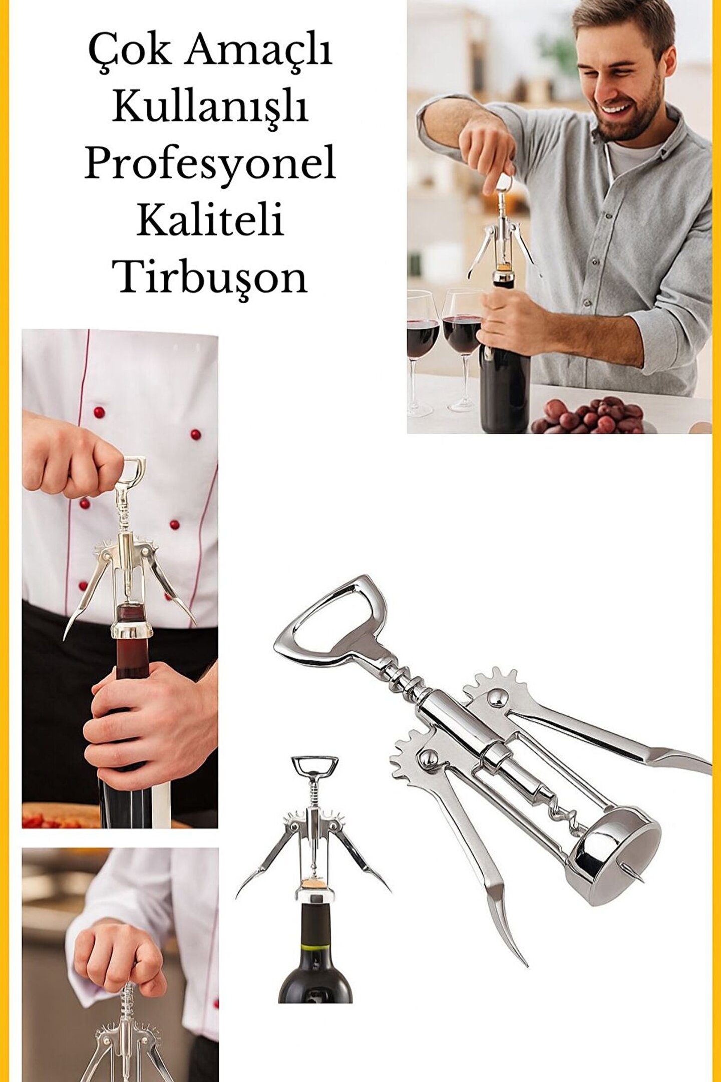 Şık tasarımı ve pratik kullanımıyla mutfakların vazgeçilmezi olan bu paslanmaz çelik tirbuşon, şarap şişelerini zahmetsizce açmanıza yardımcı olur.; Ergonomik kolları sayesinde kolay kavranır ve güçlü yapısı ile uzun ömürlü kullanım sunar.; Şarap severler, restoranlar ve profesyonel mutfaklar için idealdir.; Ayrıca kapağı kaldırmak için üst kısmında açacak detayı da bulunur.; ; ⸻ Ürün Özellikleri: •Malzeme: Paslanmaz çelik •Çok amaçlı kullanım (tirbuşon + şişe açacağı) •Ergonomik ve kaymaz sap tasarımı •Dayanıklı dişli yapısıyla kolay mantar çıkarımı •Evde, restoranda ya da profesyonel kullanım için ideal •Kolay temizlenebilir ve uzun ömürlü