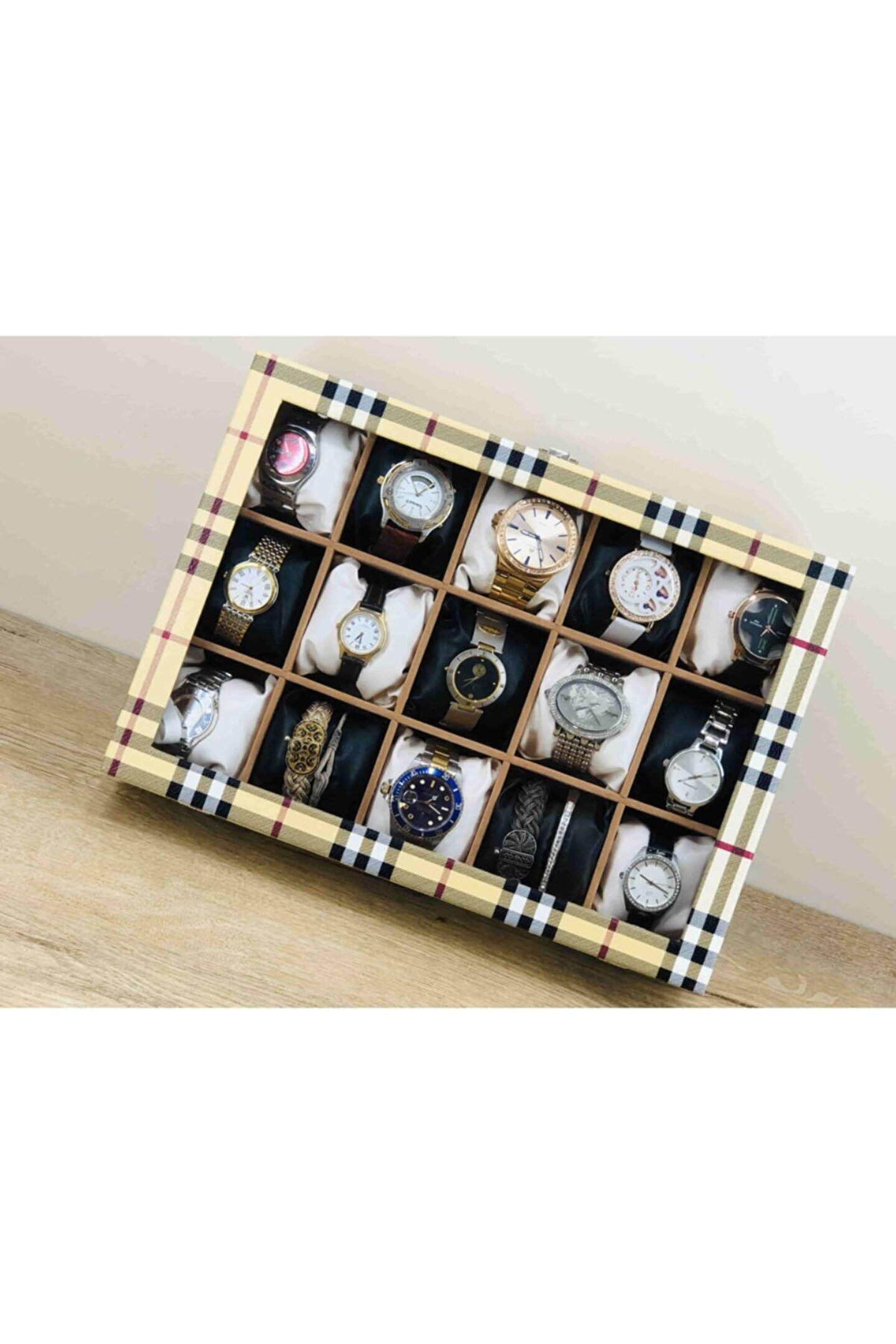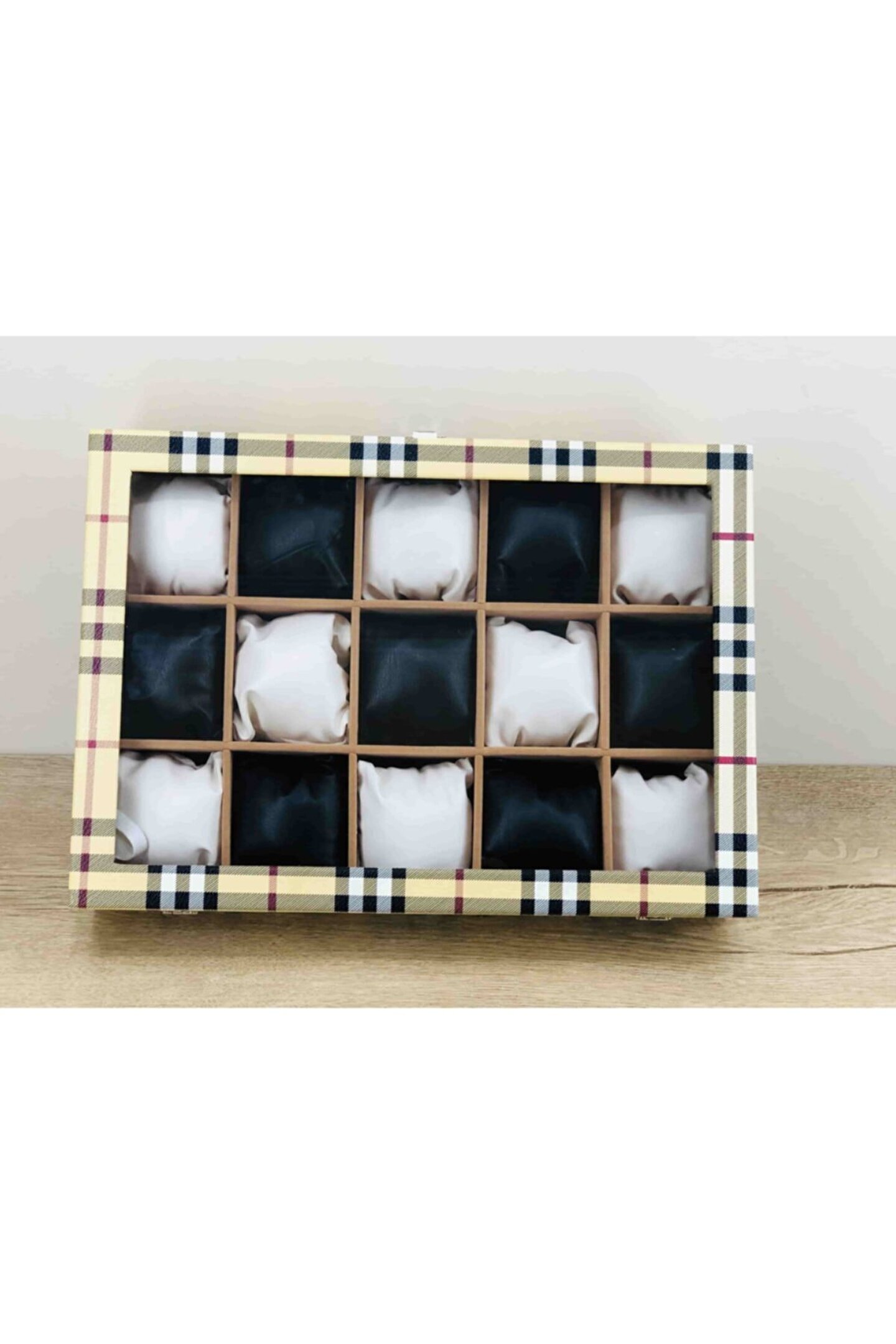 %100 orijinal türk malıdır türkiye'de üretilmiştir çin malı değildir imalattan halka satış fabrikasyon yapımı değildir tamamen el yapımıdır 15 adet büyük boy gözlüdür 15 adet siyah bayez vinlex kaplama yastıklar silikon dolgulu yumuşak yastıklar her boyuttaki saatlere kolaylıkla uyar spor ve klasik saatler için uygundur bayan ve erkek modellerine uyumludur yurt dışına gönderim ve imzalı teslimat vardır boyutları : Dış kutu boy : 241mm dış kutu en : 341mm. ; Dış kutu yükseklik : 81mm. ; Iç göz boy : 7.1mm. ; Iç göz en : 6.1mm. ; Iç göz yükseklik : 7.1mm. ; Kilit en : 25mm. ; Kilit boy : 32mm. ; Mentese boy : 18mm. ; Mentese en : 21mm. ; Resimler orjinal kendi çekimlerimizdir resimdeki saat kutusu gönderilicektir ürünlerin hepsi stoklarımızda mevcuttur stoktan aynı gün anlaşmalı kargo ile adresinize gönderilmektedir ana gövde : 5mm. ; Ahşap gövde üstü : 2mm mukavva iç kaplama;