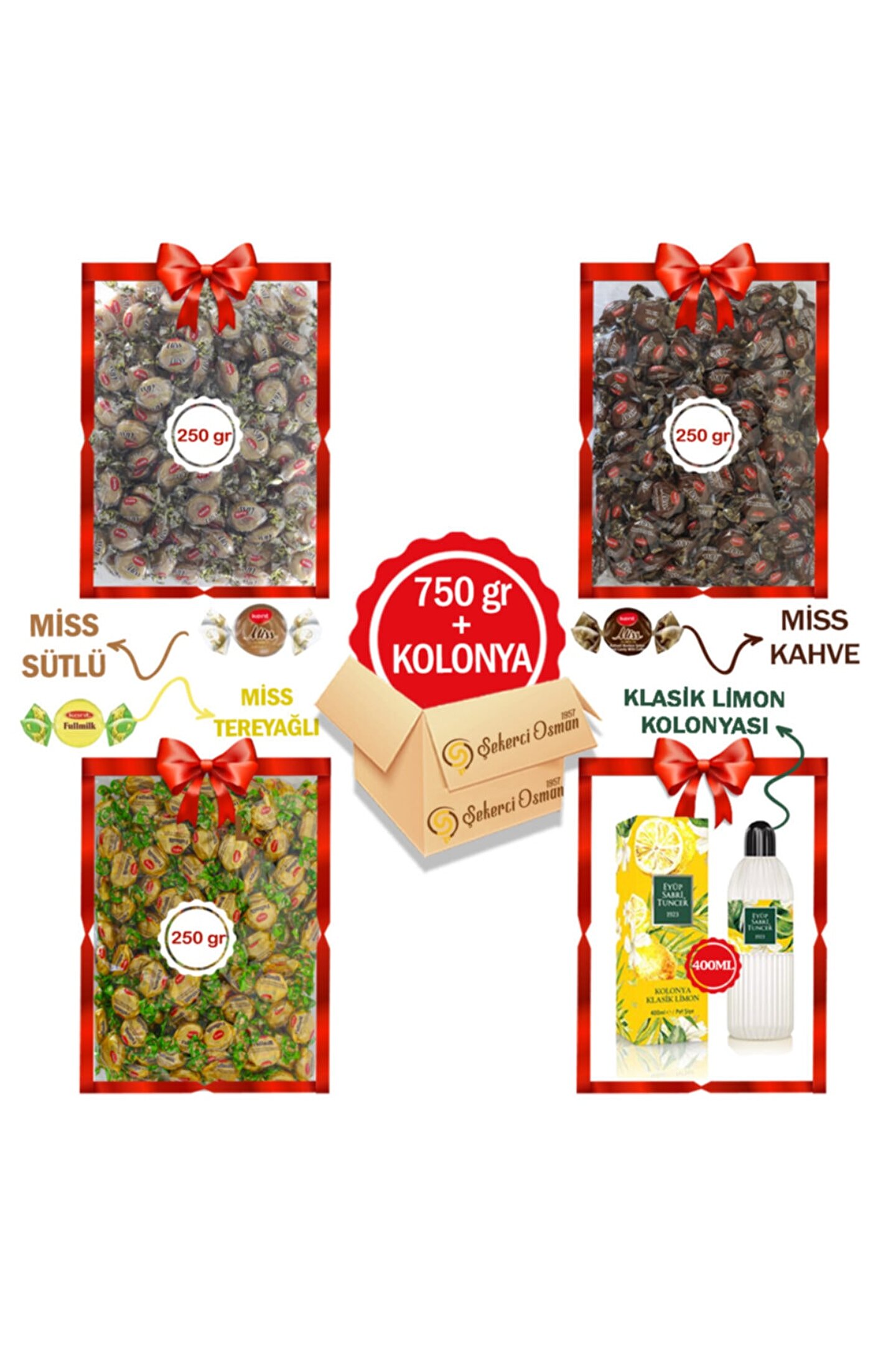 Bayram Şekeri Avantajlı Paket; 3 X 250 GR +Kolonya; Missbon Sütlü 250 GR; Missbon Tereyağlı 250 GR; Missbon Kahveli 250 GR; 400 ml Eyüp Sabri Tuncer Limon Kolonya;