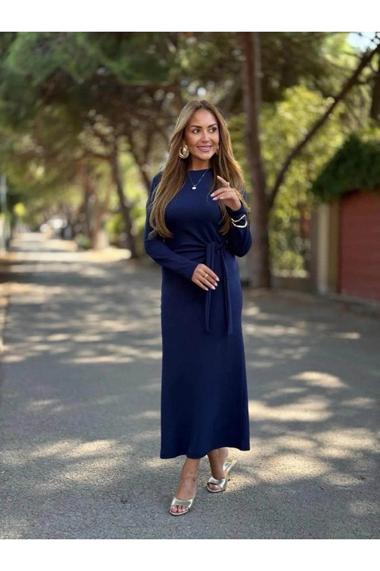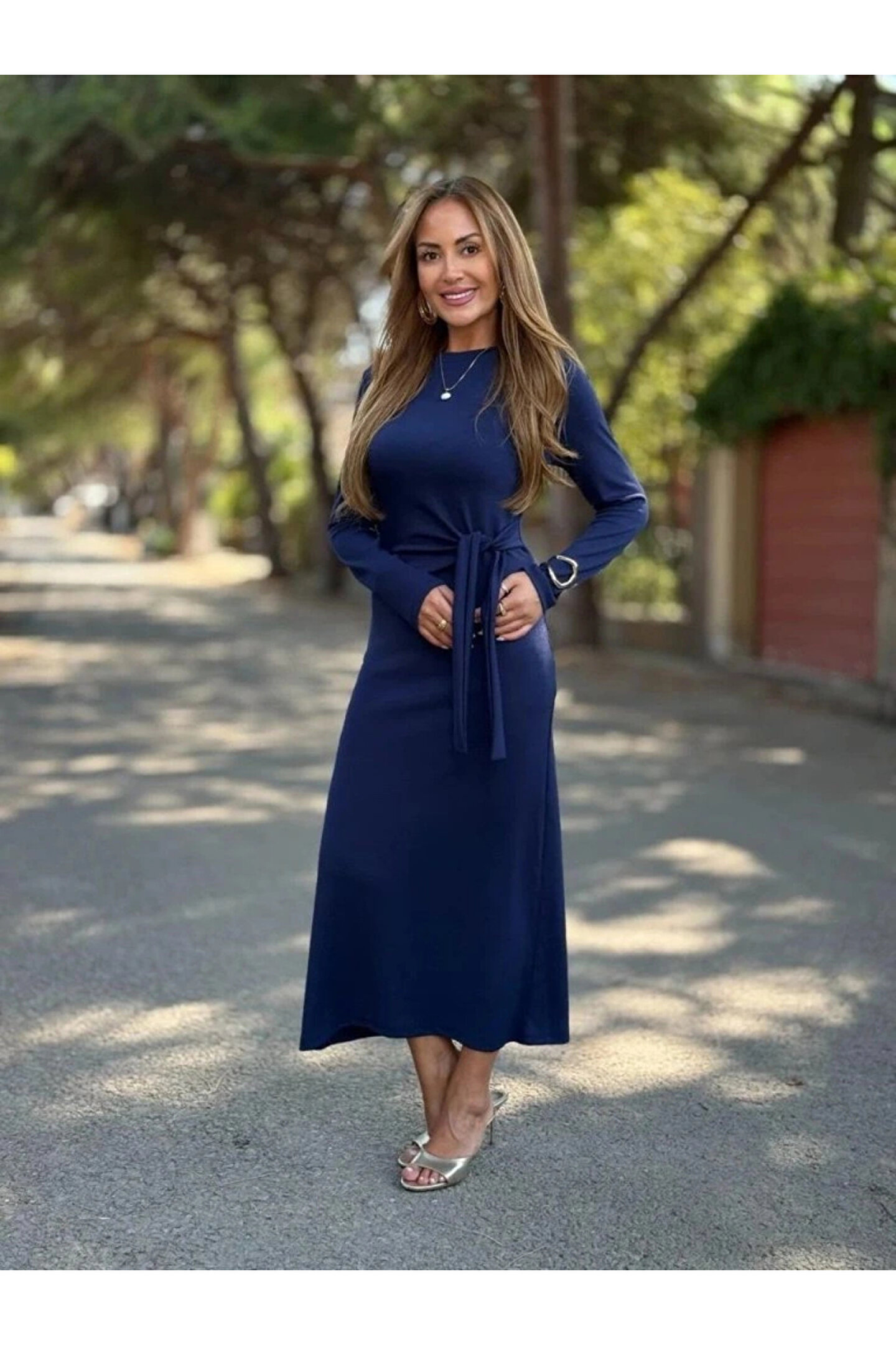 Kadın Uzun Kollu Bisiklet Yaka Yandan Bağlamalı Uzun Modal Elbise