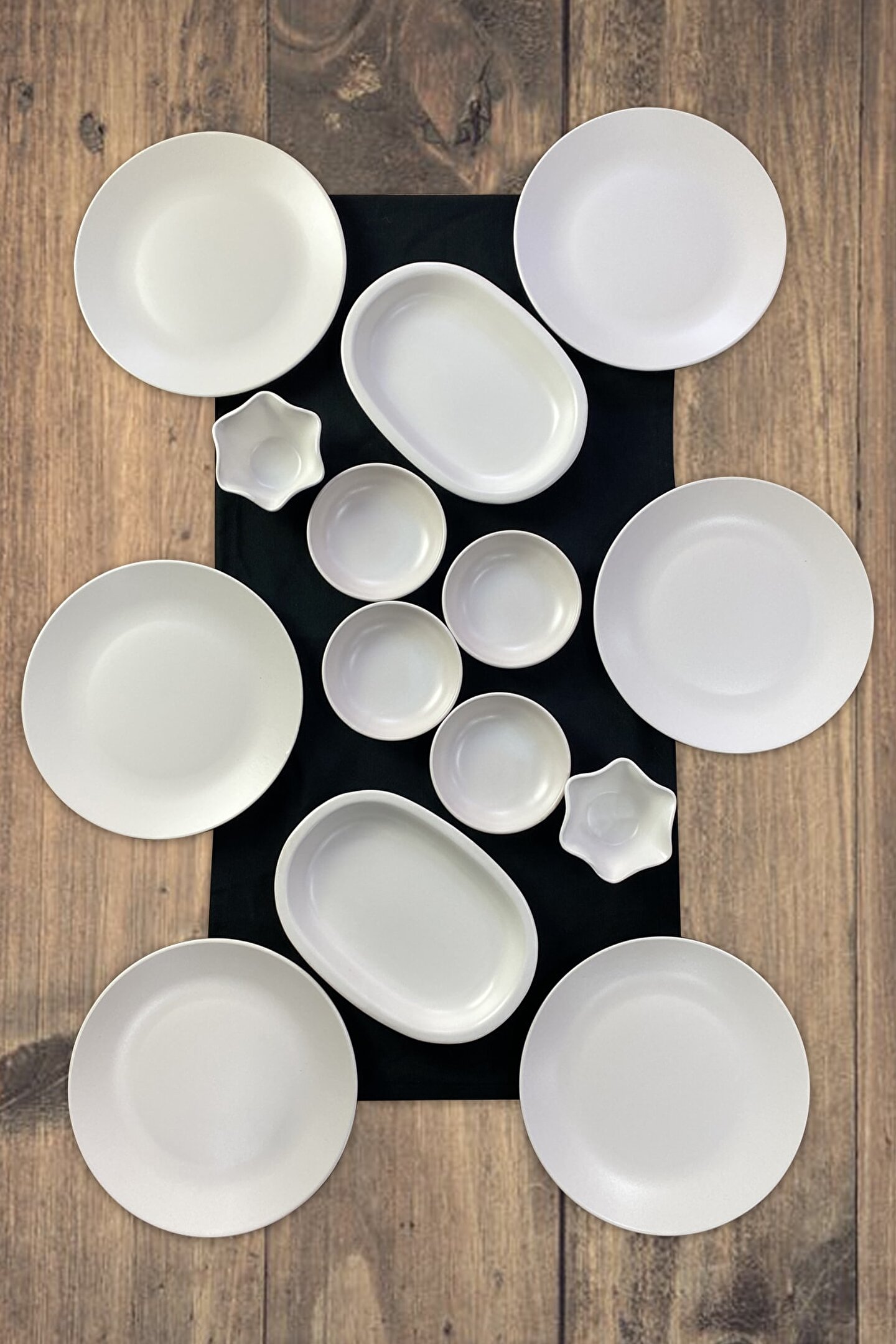 6 adet mat beyaz 25cm servis tabağı ; 4 adet mat beyaz 13cm kahvaltılık ; 2 adet mat beyaz 11cm kahvaltılık ; 2 adet mat beyaz 25cm kayık ; Ürün kullanımı: Renkleri ve baskısı solmaz. Kolay temizlenir, mikrop barındırmaz. ; Bulaşık makinesi normal ayarında yıkanabilir. ; Tamamen sağlıklı ve ekolojik malzeme yapısına sahiptir. ; Türkiye’de üretilmiştir. ; Almış olduğunuz bu üründe kırık ürün değişim garantisi bulunmaktadır. Koli içerisinde bilgilendirme broşürü yer almaktadır. ; Taşıma esnasında kırılma riskine karşı güvenli paketleme yapılarak gönderimi sağlanmaktadır. ;