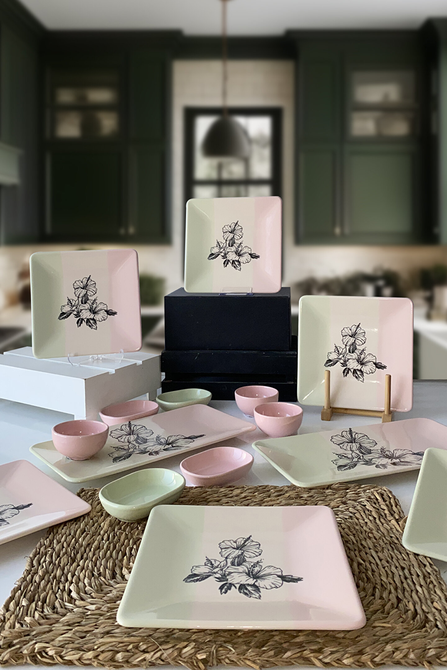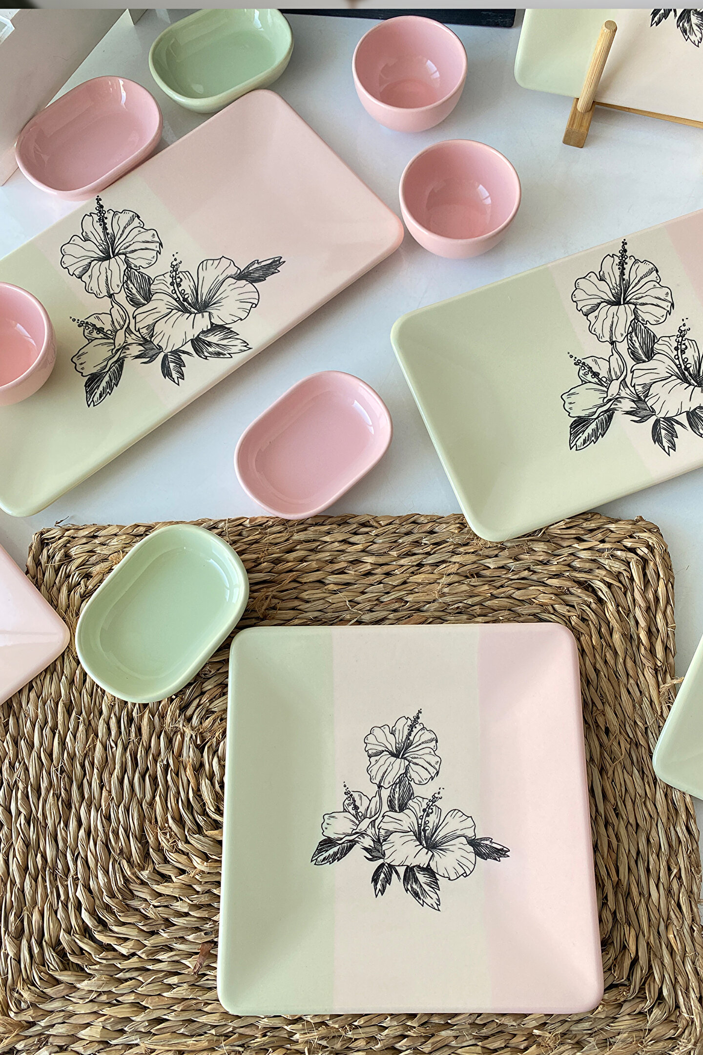 6 adet 20cm desenli kare pasta tabağı; 2 adet 31*21cm desenli dikdörtgen kayık ; 3 adet 8cm açık pembe kahvaltılık kase ; 2 adet 11cm açık yeşil kahvaltılık ; 2 adet 11cm açık pembe kahvaltılık; Ürün kullanımı: Renkleri ve baskısı solmaz. Kolay temizlenir, mikrop barındırmaz. ; Bulaşık makinesi normal ayarında yıkanabilir. ; Tamamen sağlıklı ve ekolojik malzeme yapısına sahiptir. ; Türkiye’de üretilmiştir. ; Almış olduğunuz bu üründe kırık ürün değişim garantisi bulunmaktadır. Koli içerisinde bilgilendirme broşürü yer almaktadır. ; Taşıma esnasında kırılma riskine karşı güvenli paketleme yapılarak gönderimi sağlanmaktadır. ;